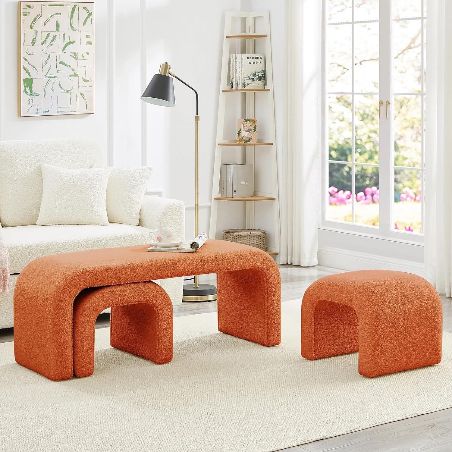 Modern 3-Piece Upholstered Bench Set, 44" Wide Teddy Footstools for Living Room Bedroom (Orange)