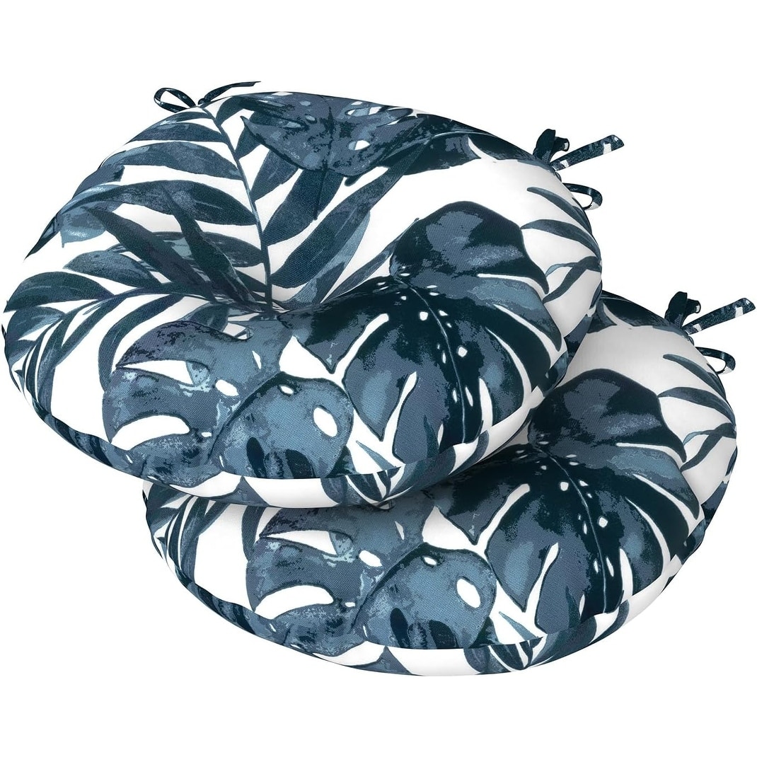 Set of 2 Round Chair Cushions with Ties, Water Repellent, Outdoor Tufted Pads for Garden, Dining, Bar Stool - Palm Blue