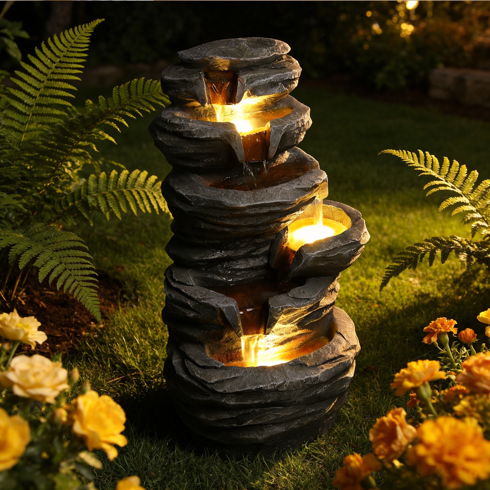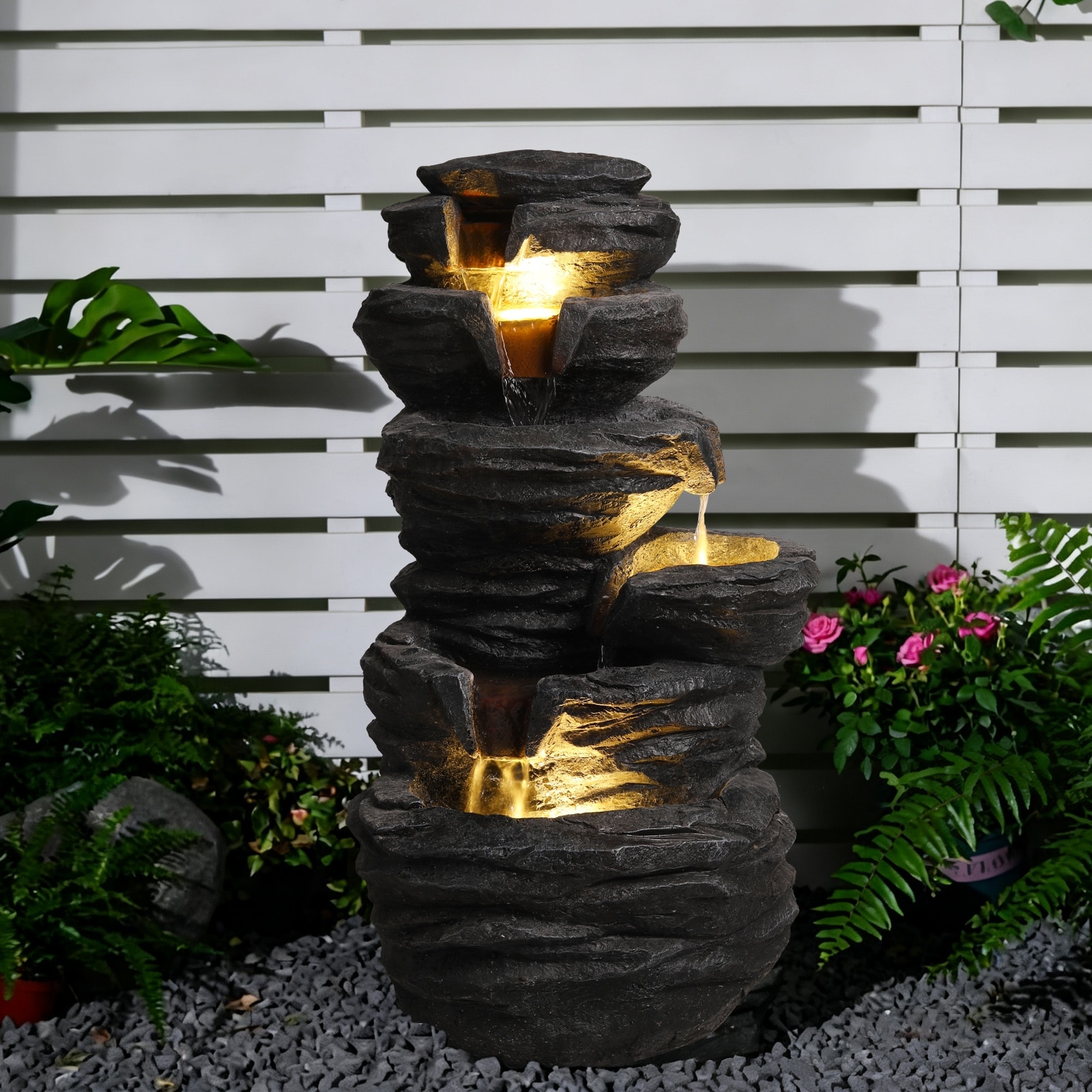 This multi-tier outdoor rock fountain features realistic stone texture and warm LED lights, offering soothing water flow and calming sounds.