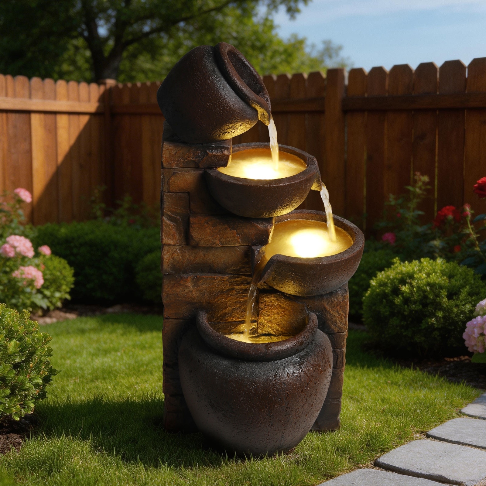 This 4-tier pot-style outdoor fountain delivers gentle cascading water and warm LED lighting for a relaxing ambiance.