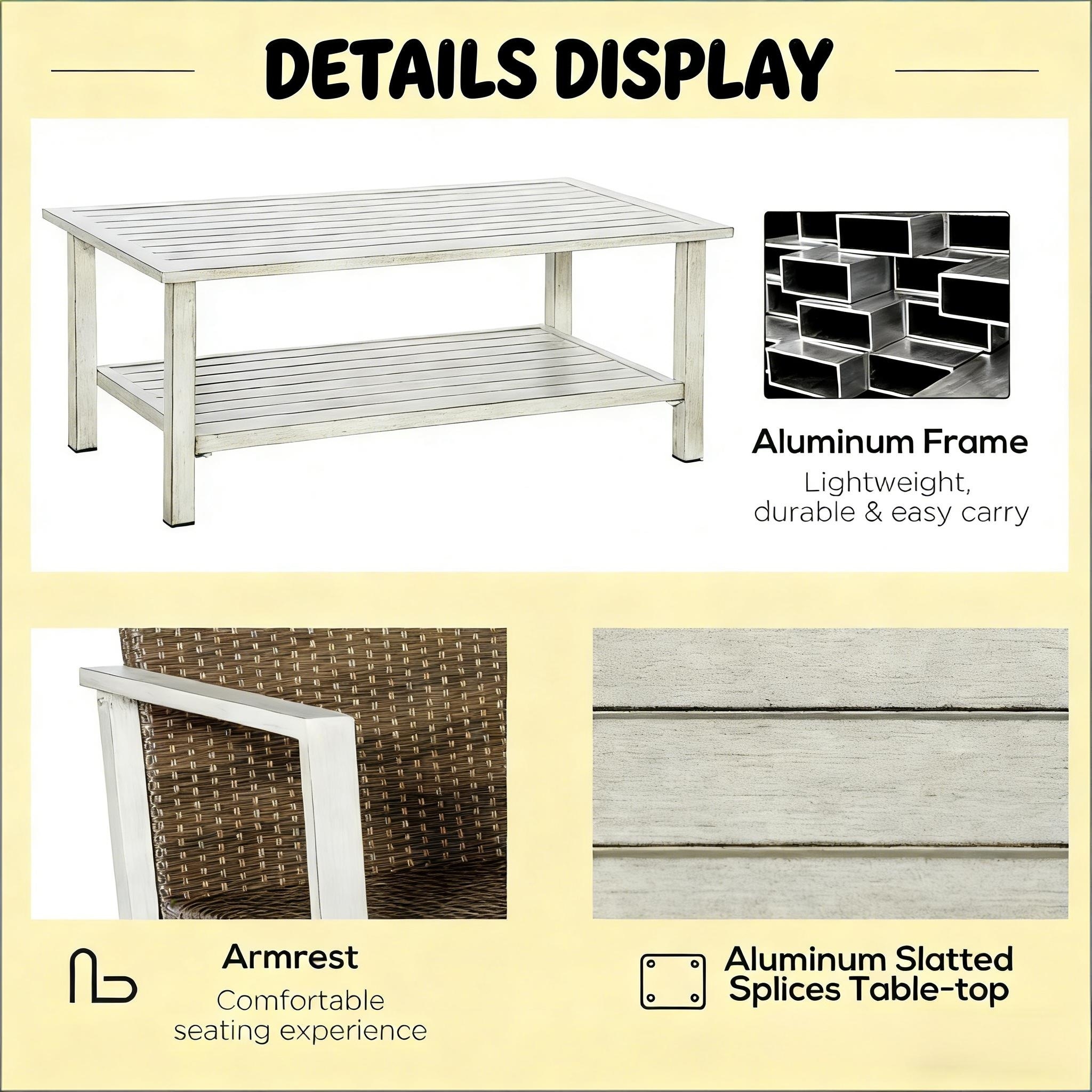 Marketing Copy: Create the ultimate outdoor gathering space with our premium 7-Piece Aluminum Patio Conversation Set, featuring a 75" three-seat sofa, 52" loveseat, two armchairs, two ottomans, and a large tempered-glass coffee table—perfect for patios,…