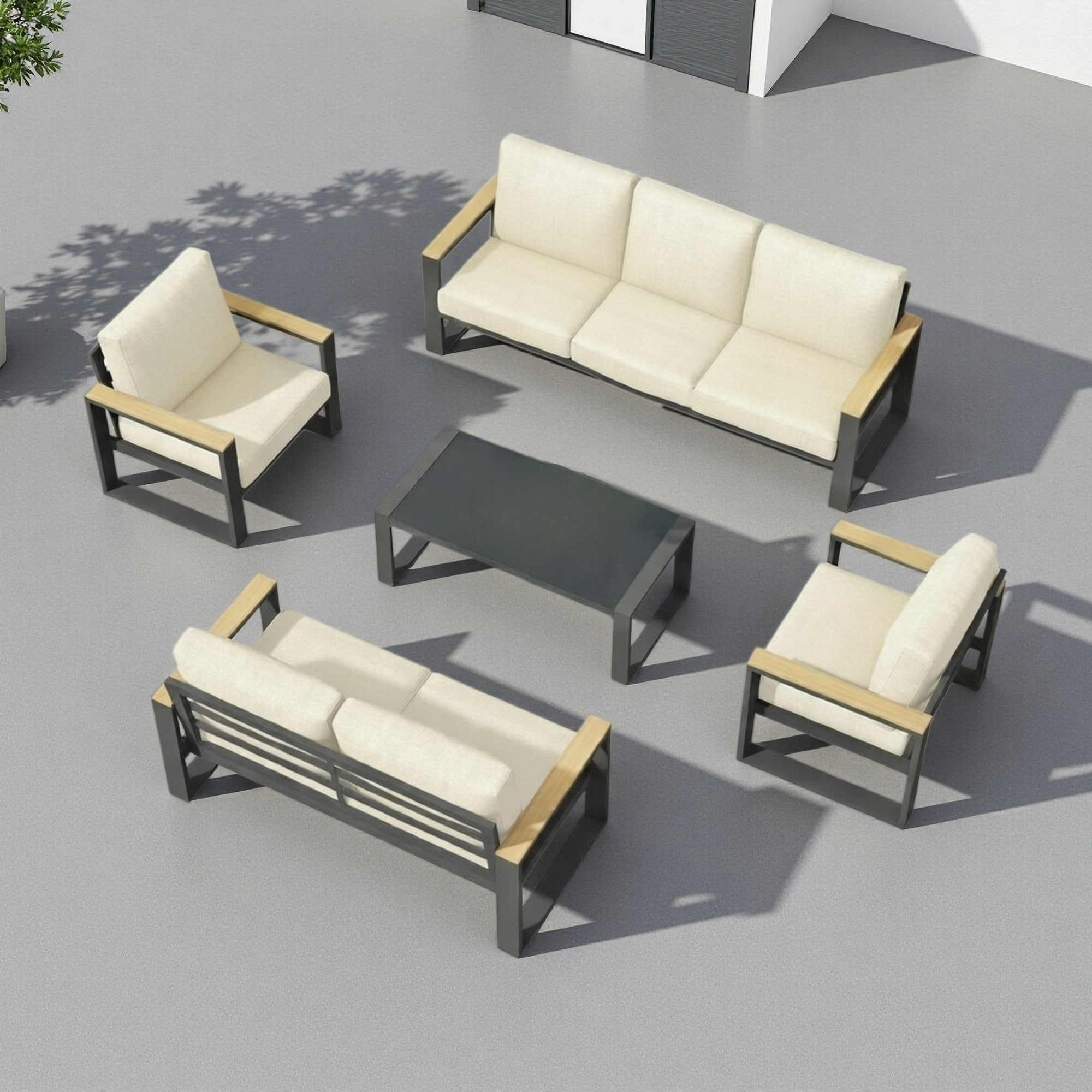 Marketing Copy: Create the ultimate outdoor gathering space with our premium 5-Piece Aluminum Patio Conversation Set, featuring a 75" three-seat sofa, 52" loveseat, two armchairs, and a large tempered-glass coffee table—perfect for patios, decks,…