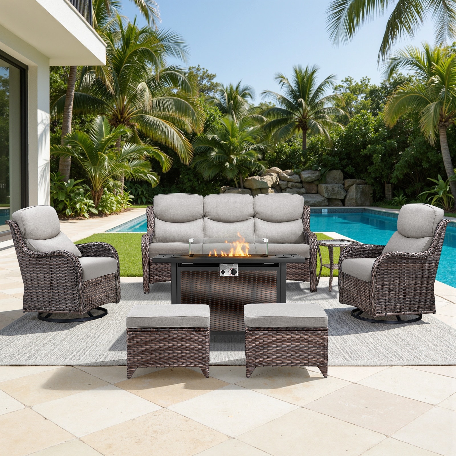 Meyreso 7-Piece Outdoor Patio Metal Fire Pit Wicker Conversation Set with 5-Inch Thick Olefin Cushions