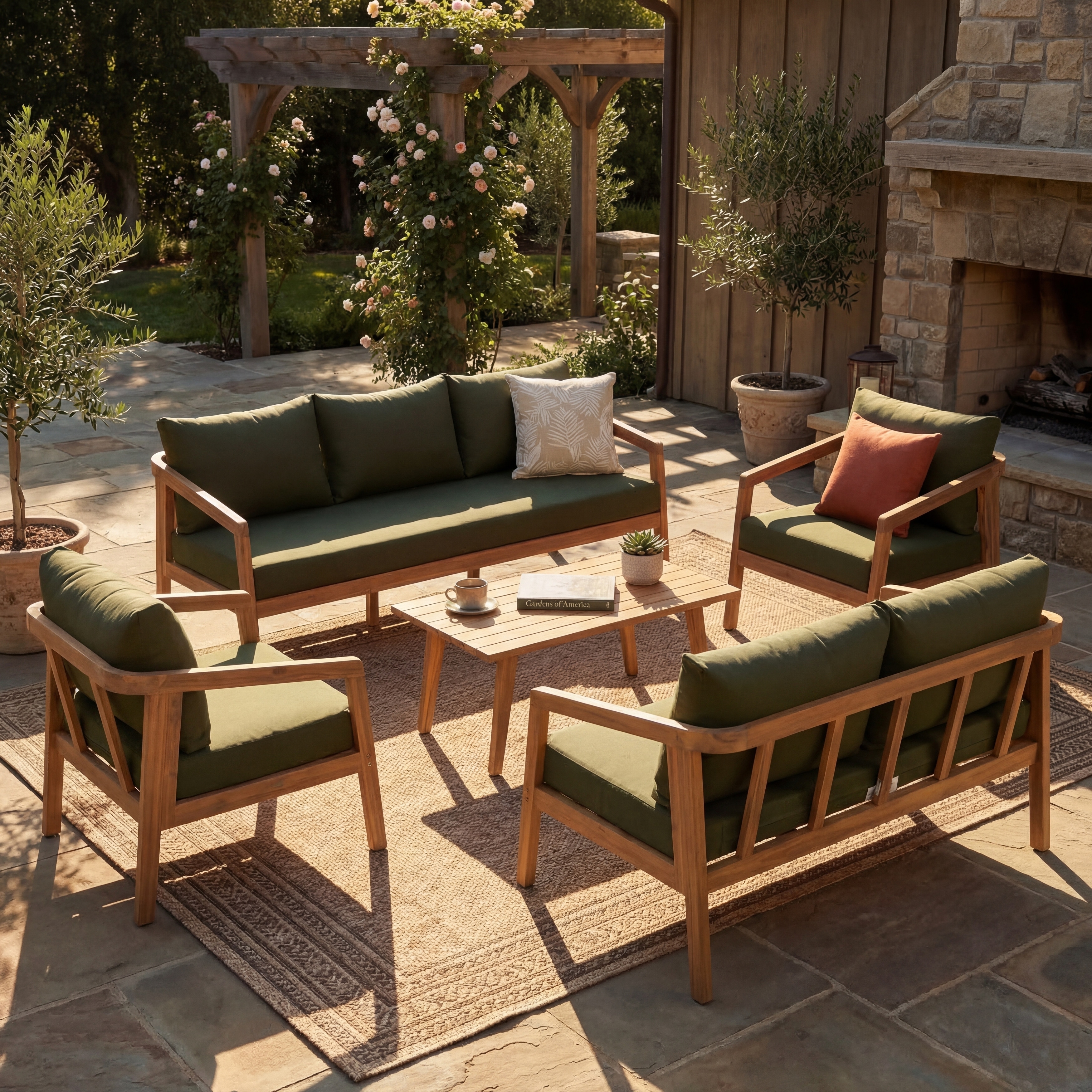 The Logan 5-Piece Teak Patio Conversation Set brings a perfect mix of style and comfort to your outdoor space.