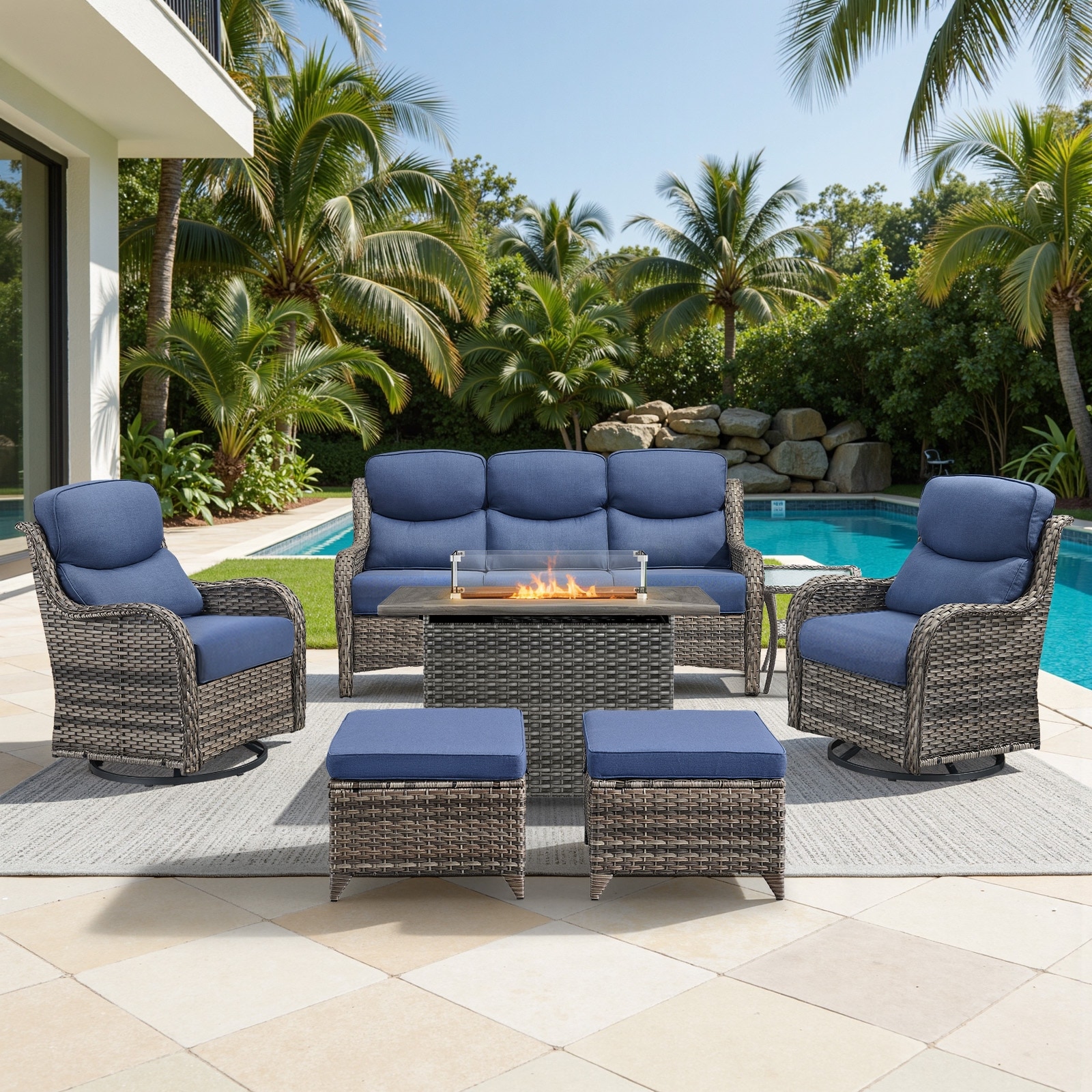 Meyreso 7-Piece Outdoor Patio Wicker Fire Pit Conversation Set with 5-Inch Thick Olefin Cushions