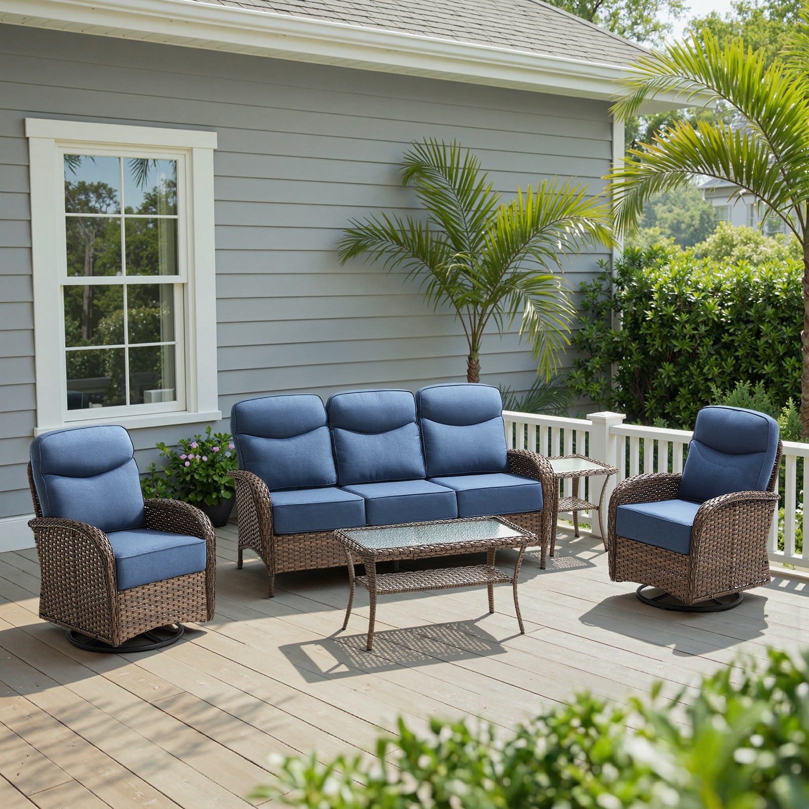 Meyreso 7-Piece Wicker Patio Conversation Set with Swivel Gliders and 6-Inch Thick Cushions