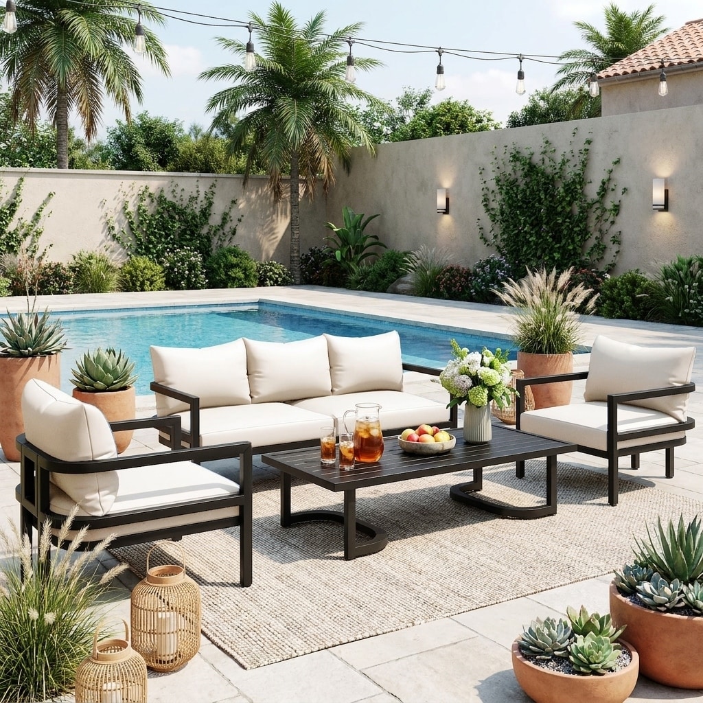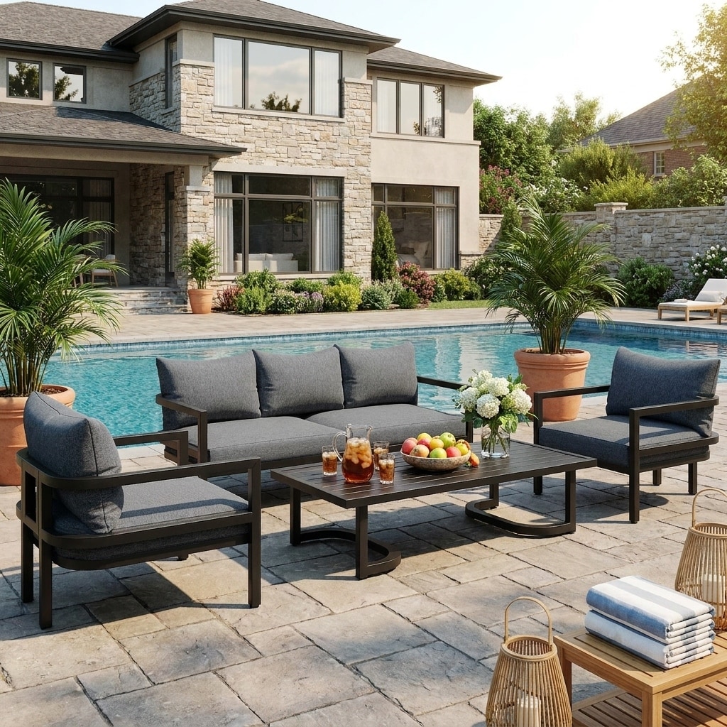 Bring a polished, welcoming look to your patio, porch, balcony, or backyard with this 4-Piece Outdoor Steel Conversation Set, a stylish collection designed for both everyday comfort and long-lasting outdoor performance.