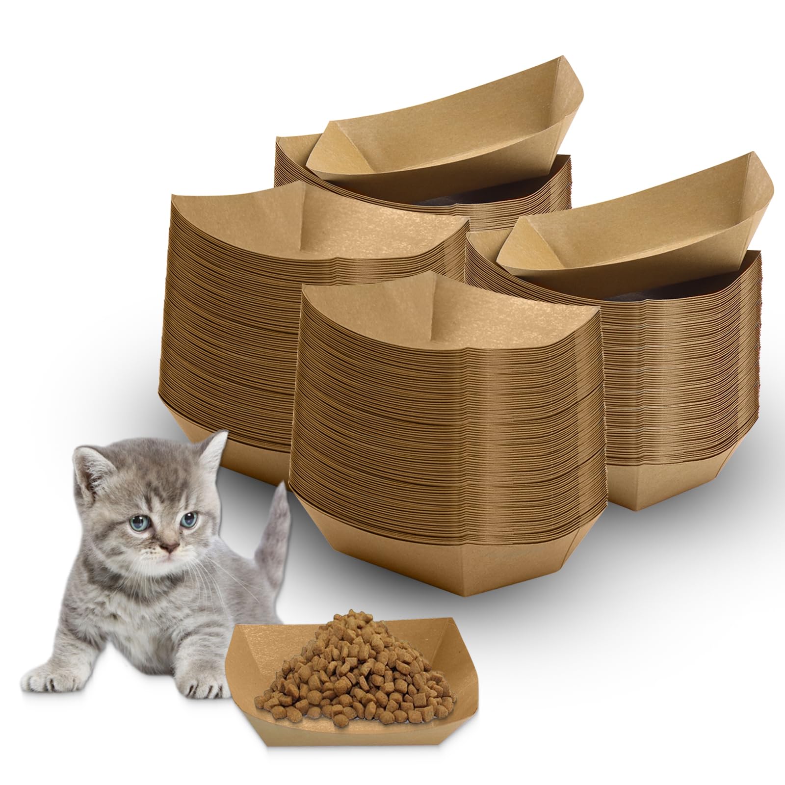 QUALITY MATERIAL: Our disposable feeding bowls are made of high quality pulp material. The material is thickened, and disposable cat food bowls small built-in 18PE matte shower film, smooth surface, waterproof and oil-proof, high temperature resistant, safe and reliable, no need to worry about food