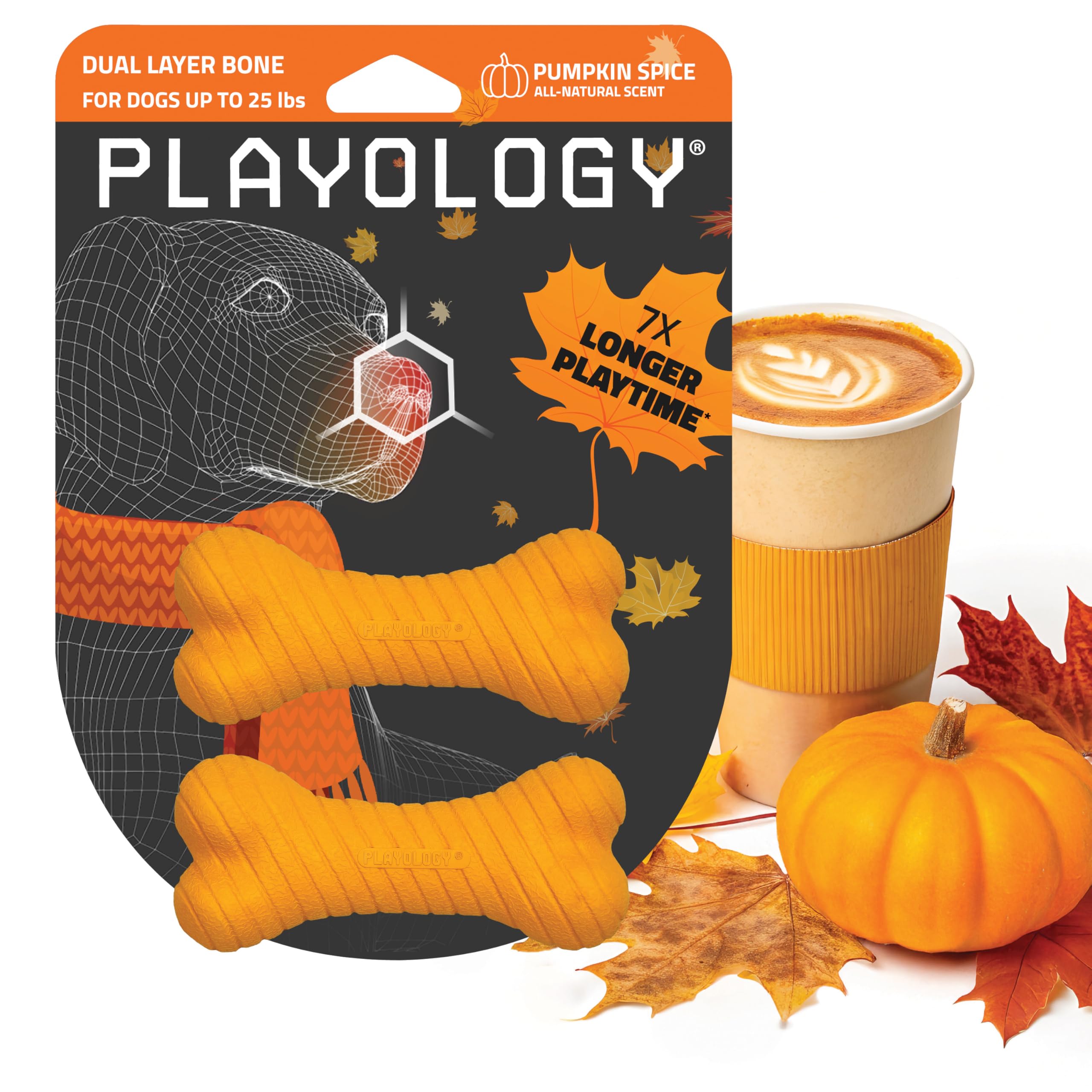 MEET THE DUAL LAYER BONE: Made with a durable 2-layer design and embedded with an all-natural Pumpkin Spice scent, this rubber chew toy is scientifically designed to mimic the feel of a real bone and keep your dog busy and engaged in playtime up to 7x longer than unscented dog toys. Mix and match wi