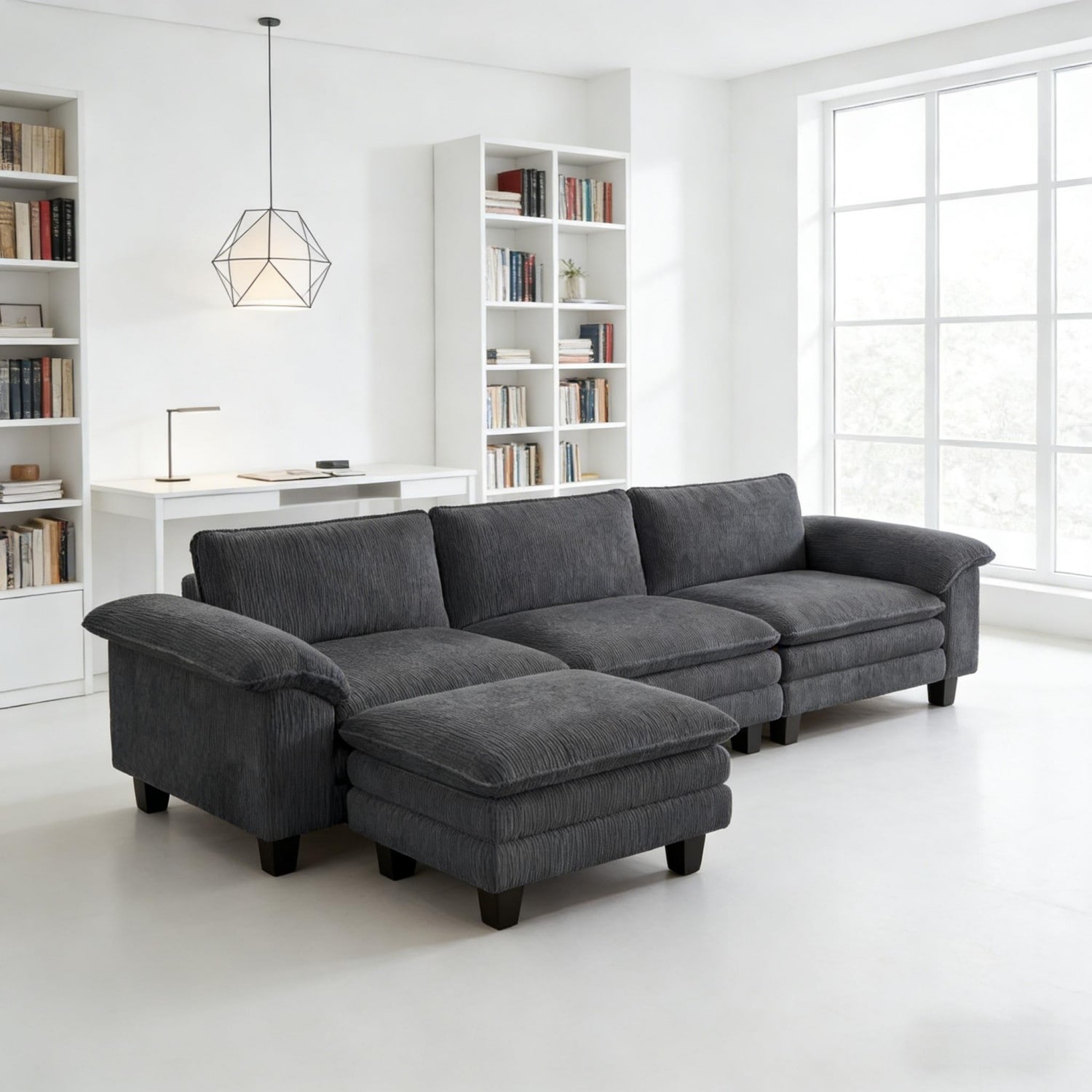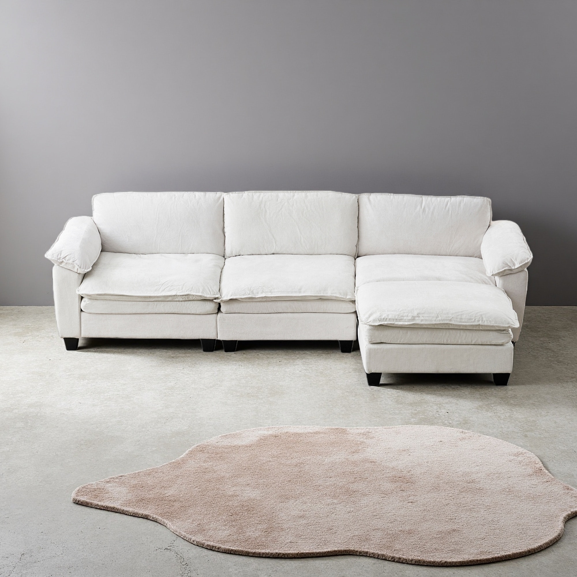 Description Upgrade your living space with this L-shaped modular sectional sofa with ottoman, crafted from premium chenille fabric for a soft, breathable touch.