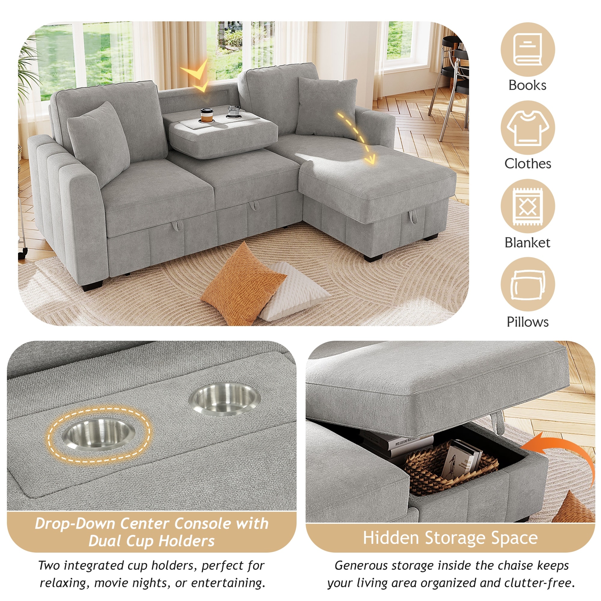 L-Shaped Sectional Sofa with Pull-out Sofa Bed, Modular Sleeper Sofa Couch with Reversible Storage Chaise for Living Room