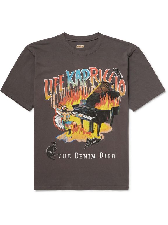 Men's Kapital Printed Cotton-Jersey T-Shirt - Gray - Short sleeve t-shirts KAPITAL's 'Burning Piano' T-shirt is like a fever dream – it's printed with a mishmash of motifs, including fire, cats and a crow. Made in Okayama, Japan, it has slightly...