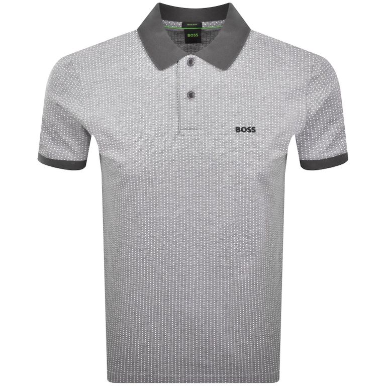 Men's Boss Dot Print Polo T Shirt - Gray - Polo shirts BOSS Dot Print Polo T Shirt In Grey. Regular Fit. A cotton pique polo t shirt with a two button placket a ribbed polo collar and ribbed cuffs on the short sleeves. An all over dot pattern in...