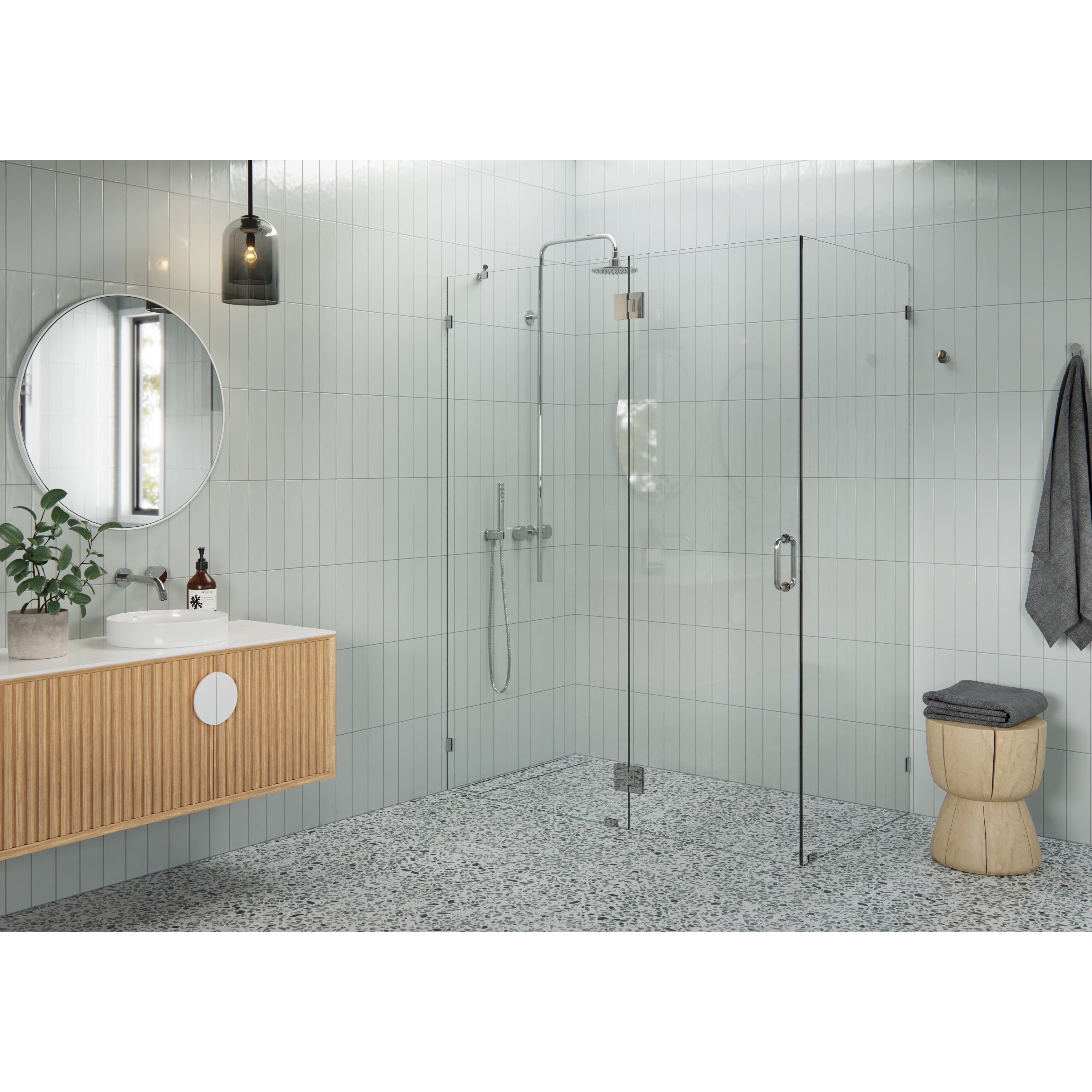 Highlight the fixtures in your bathroom with the understated minimalism of a glass-hinged corner shower enclosure. Taller than most competitor shower enclosures, our frameless 3/8" tempered glass panels come in a standard 78" height.