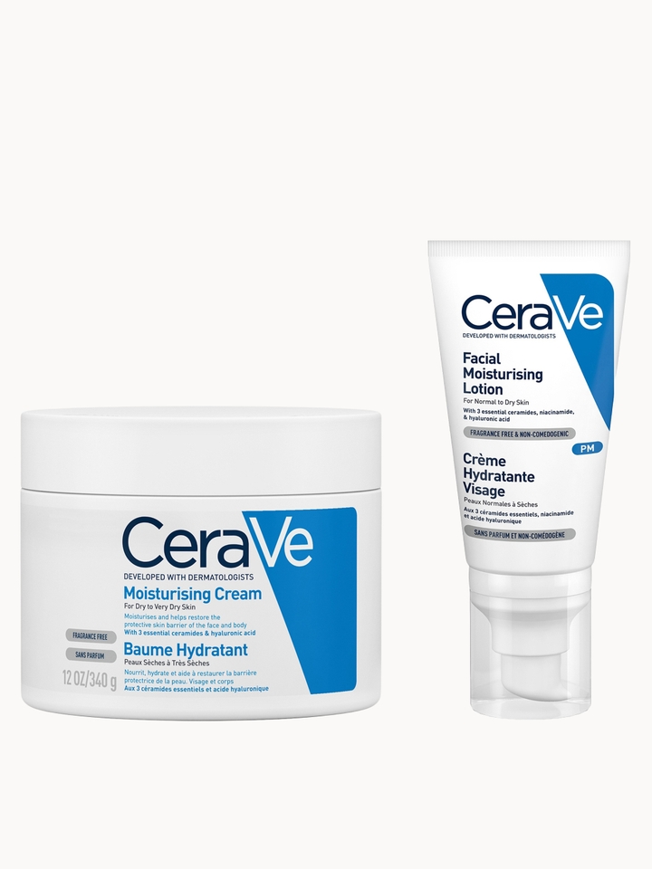 Nourish dry-feeling skin with the CeraVe Evening Moisturising Routine, a duo of hydrating essentials designed to elevate your evening self-care routine. The body cream and facial moisturiser are infused with a blend of hyaluronic acid and essential ceramides to nourish the skin’s natural moisture