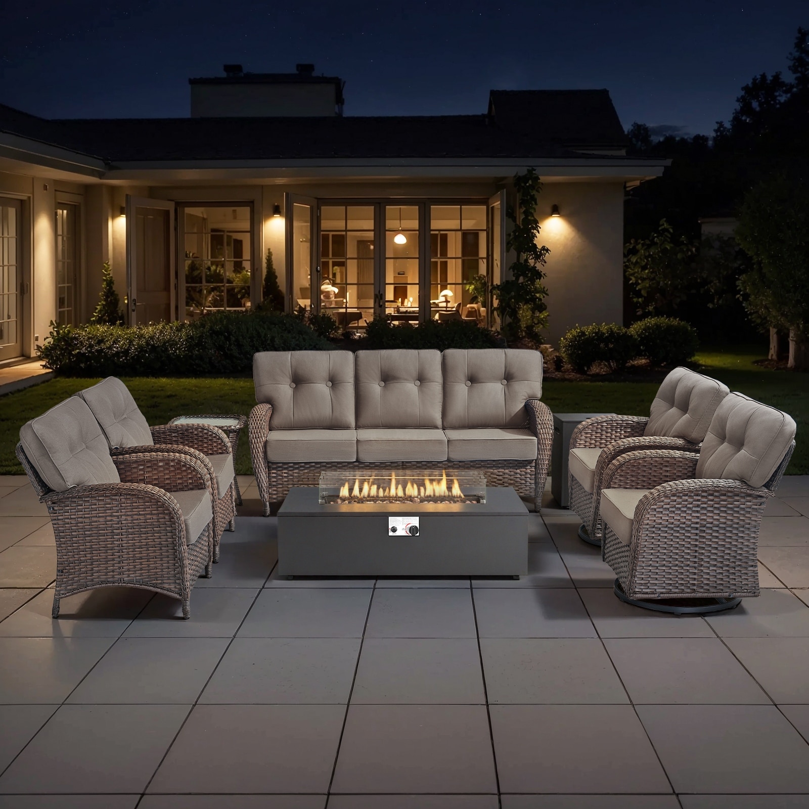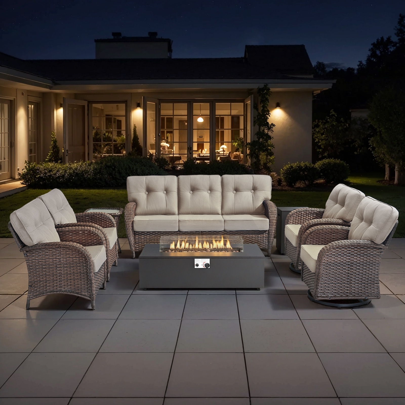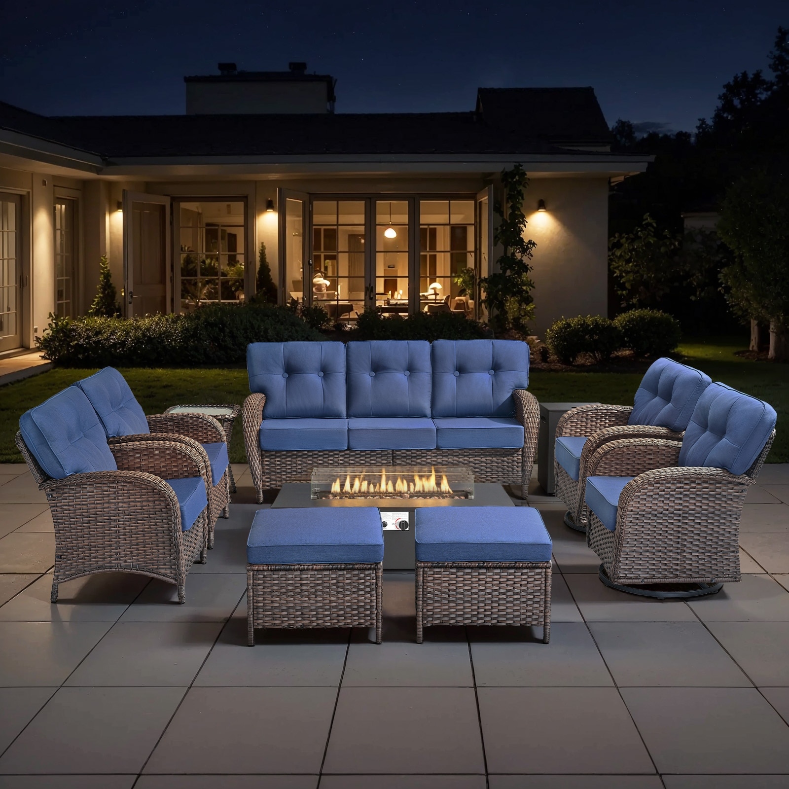 Transform your outdoor space into a luxurious retreat with this Outdoor Wicker Patio Furniture Set! It includes a spacious sofa, 2 club chairs, 2 swivel chairs,a side table, and a 55,000 BTU propane fire pit table (2 ottomans options provided.)
