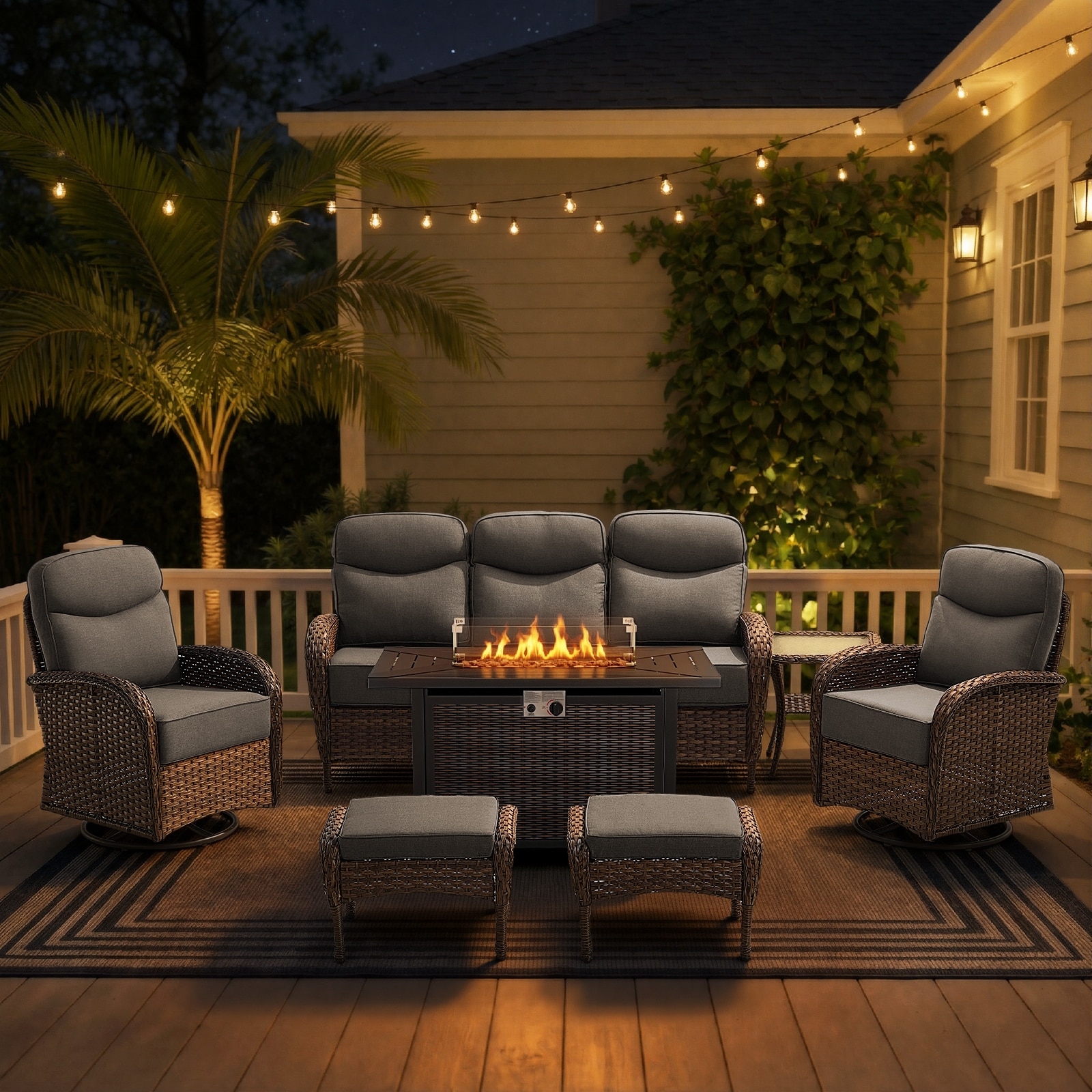 Gymojoy 7-Piece Fire Pit Outdoor Wicker Conversation Furniture Set with 6" Cushions, 55,000 BTU Propane Table
