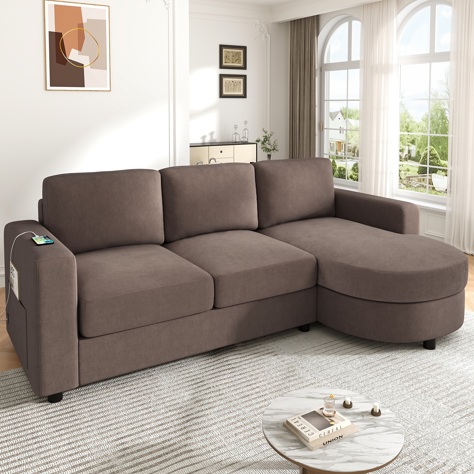 This sofa features an ergonomic curved design with a seat crafted from 32D high-resilience sponge, offering rapid rebound and exceptional durability.