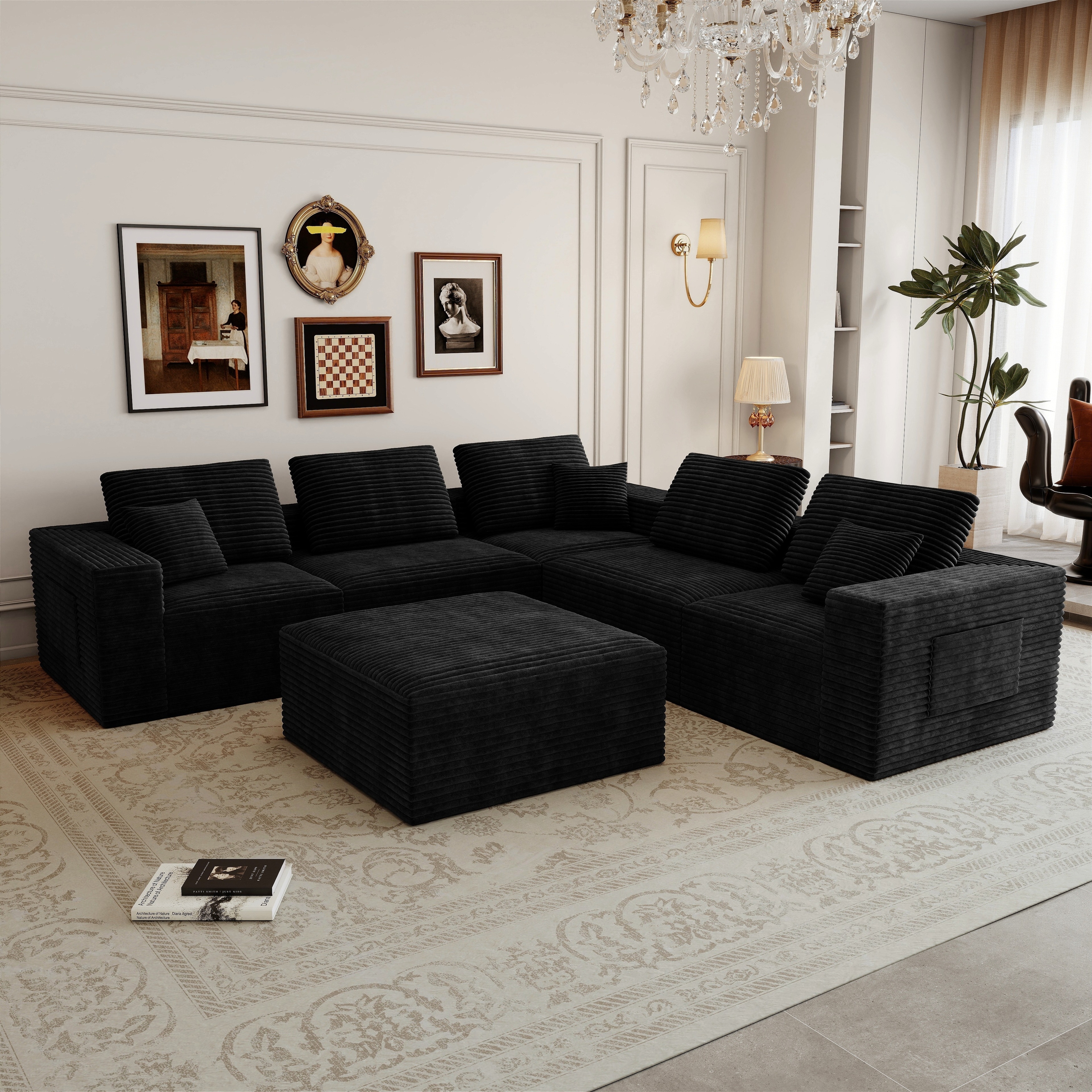 Roomfitters Modern Modular Sectional Sofa with Ottoman, Ribbed Corduroy L-Shaped Corner Couch for Living Room, Black