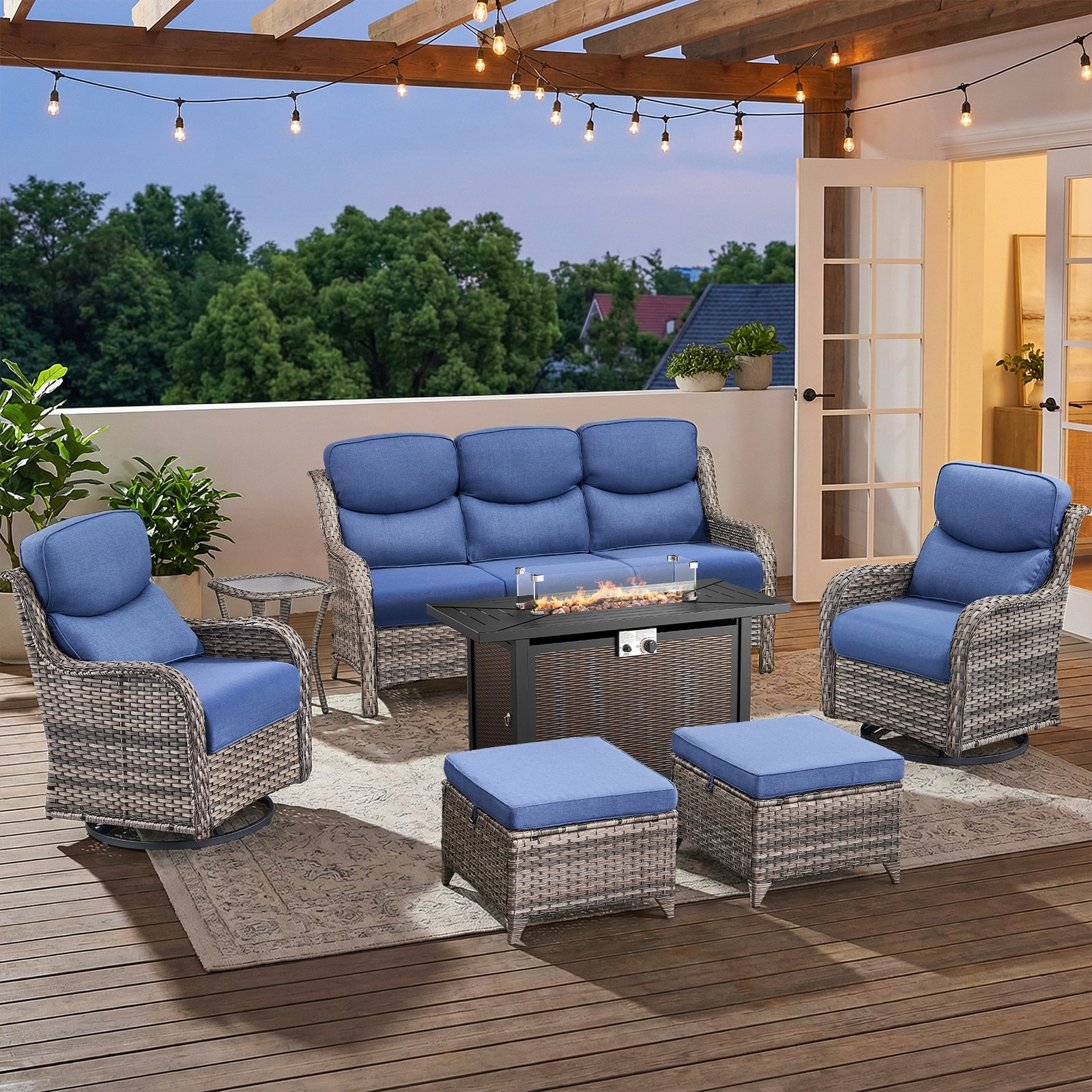 Pocassy 6/7 Piece Patio Sofa Swivel Chair Set with 43" Fire Pit Table
