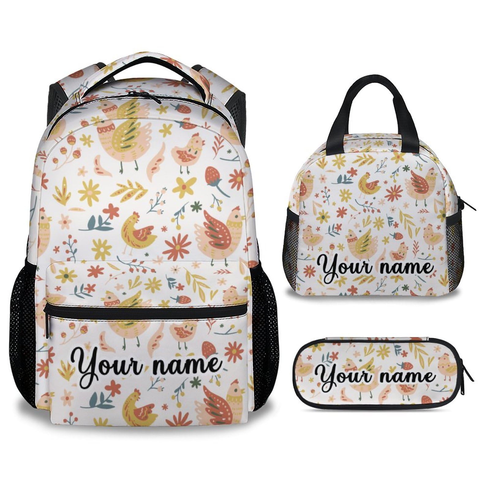 COOPASIA Personalized Chicken Backpack with Lunch Box and Pencil Case, 16 Inch Chicken Theme Bookbag with Adjustable Straps, Lightweight, Durable,