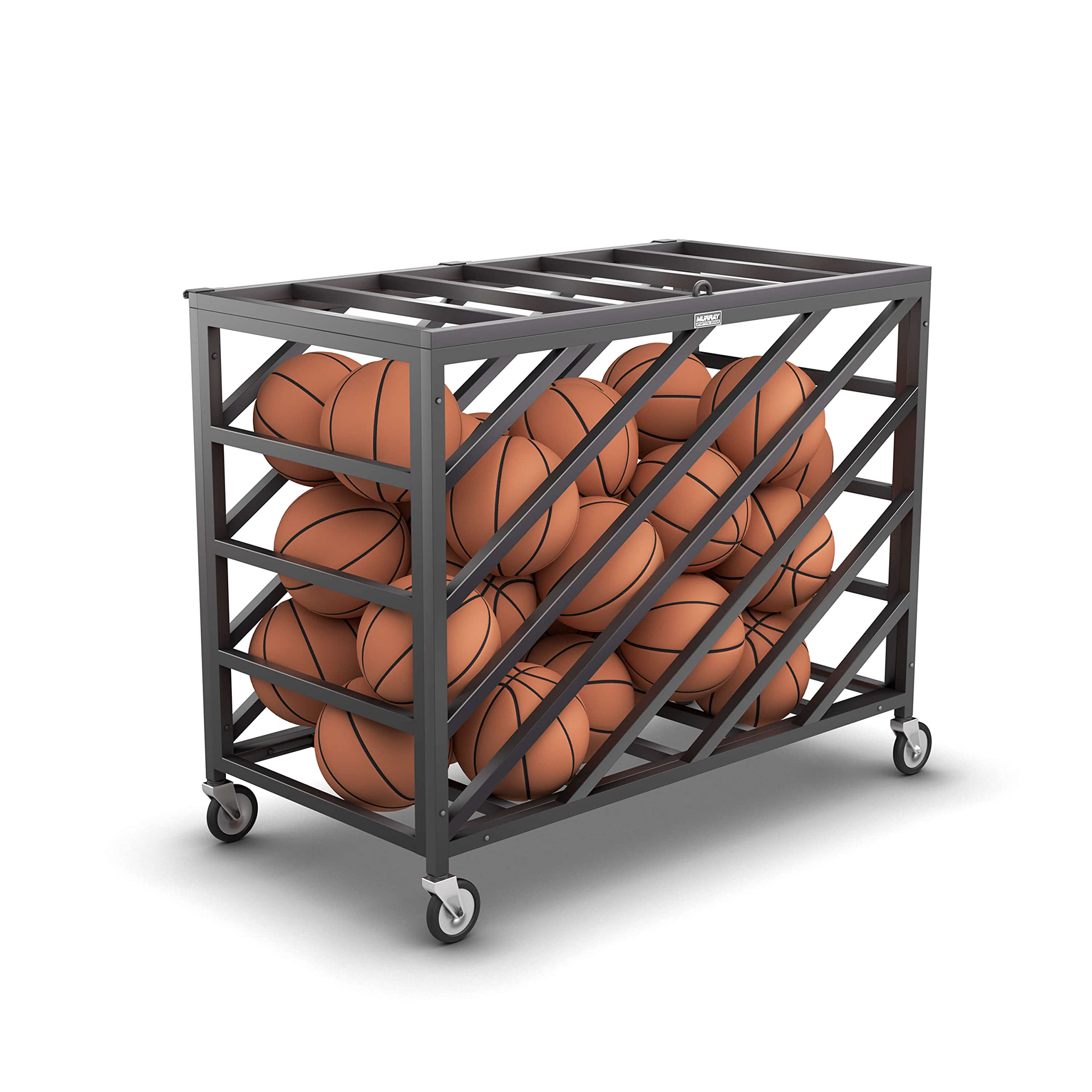 HEAVY-DUTY DESIGN: 1" steel tubes frame with black powder coat finish VERSATILITY: Holds up to 30 basketballs or 36 volleyballs - perfect ball storage solution SECURE STORAGE: Hinged cover that can be locked (lock not included) EASILY TRANSPORT: Multi-directional wheels and handle allows you to smoo