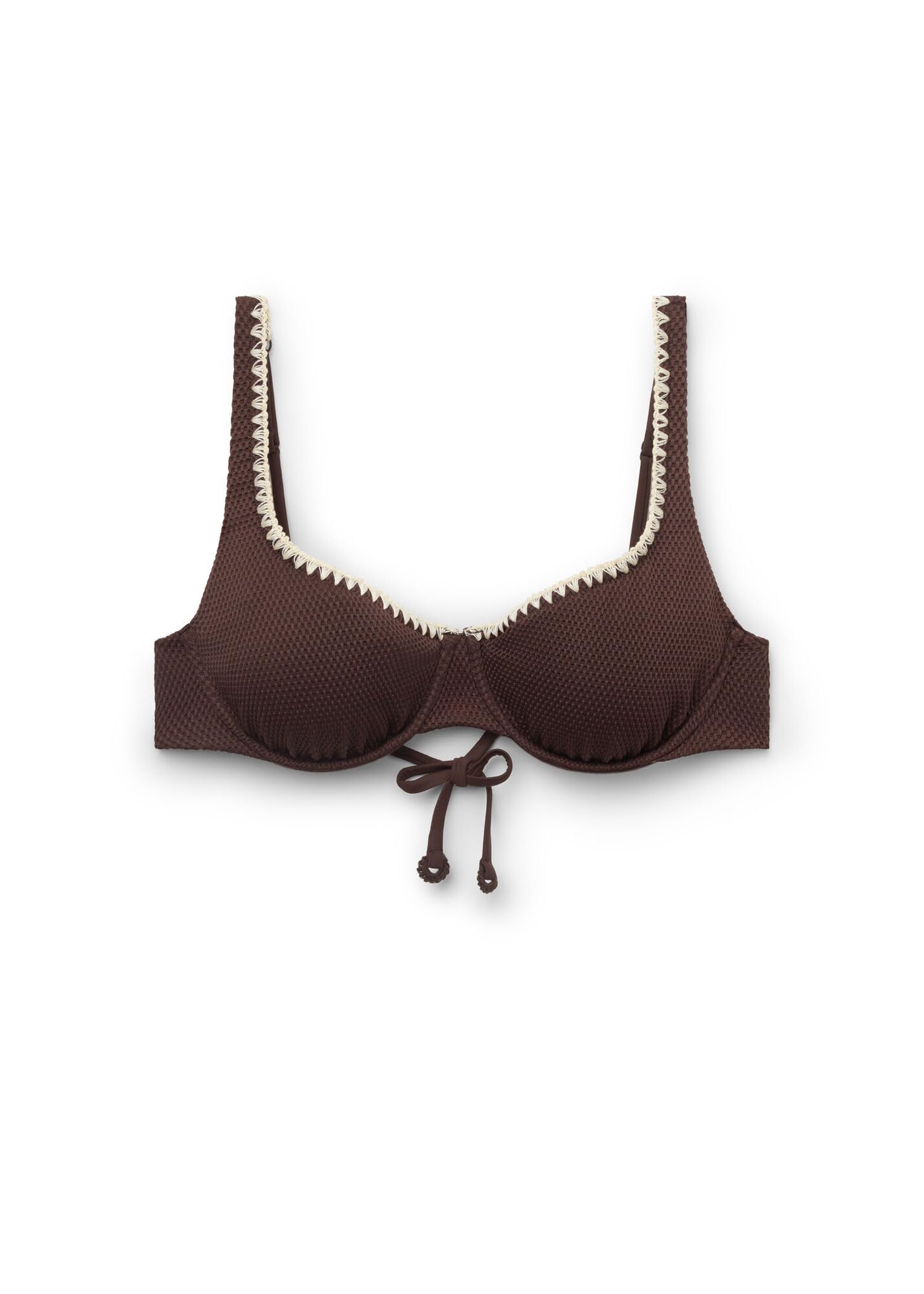 Unpadded balconette bikini top with a high center and underwire that guarantees excellent support, adapting perfectly to all sizes Soft, slightly embossed fabric, embellished with contrasting embroidery on the edges that enhances the design with distinctive character and elegance Adjustable shoulder