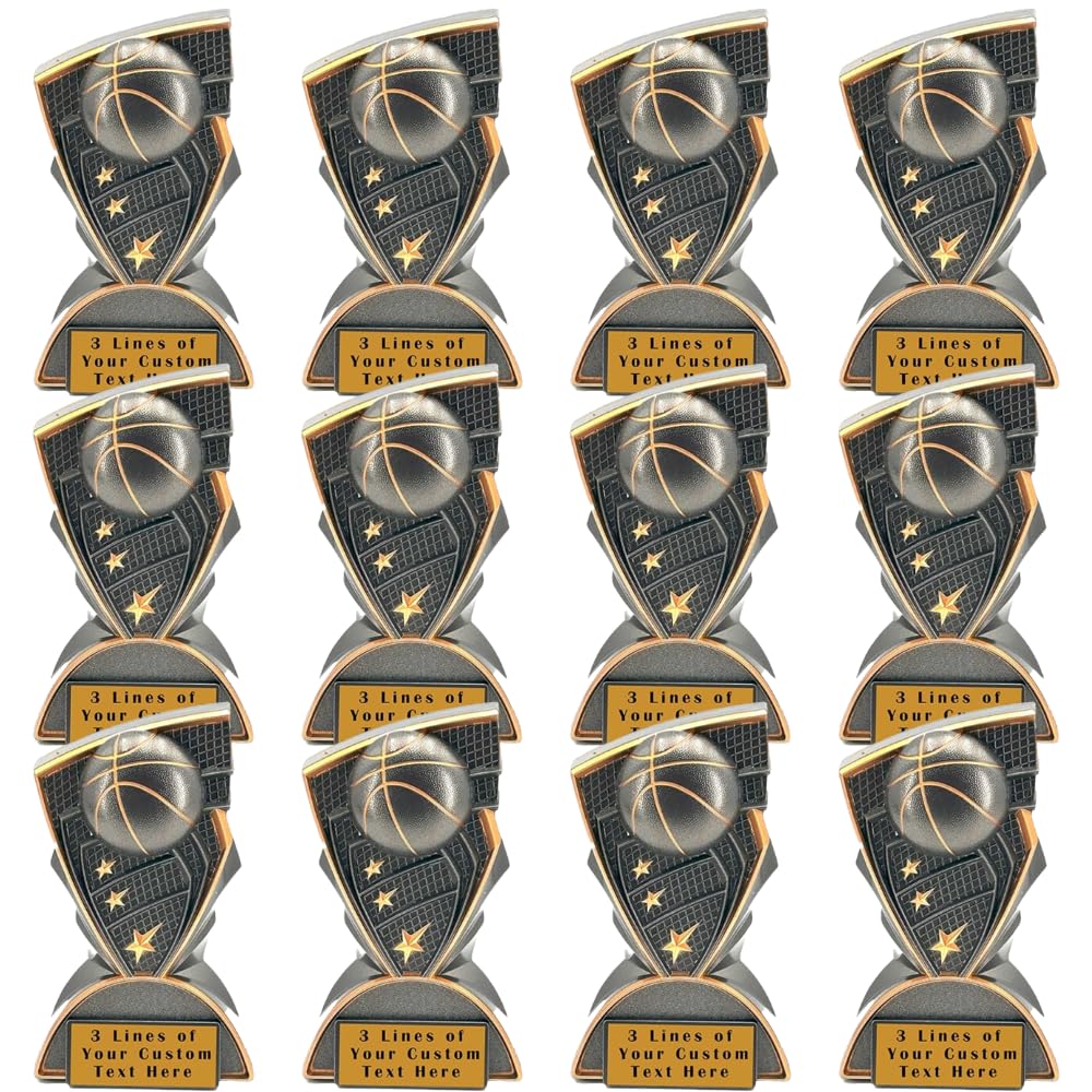 PREMIUM SOLID DESIGN: Case of 12 - 1.3lb, 6.5" tall, 2.5" thick, and 4" wide Basketball trophies featuring elegant black graphite finish with striking gold accents and decorative star details and attached personalized laser engraved plate. PERSONALIZE: If you do wish to enter different text for each