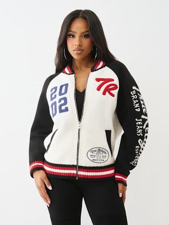 Women's True Religion Logo Raglan Shirt Zip Cardigan - Gray - Cardigans The Logo Raglan Zip Cardigan is a layer youll reach for on repeat. Designed with raglan sleeves and varsity-striped trim, this cozy cardigan features a zipper closure, side...