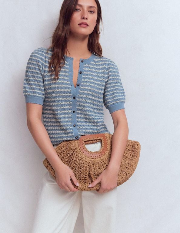 Women's Boden Dot Pointelle Cardigan - Blue - Cardigans You can count on Dot to elevate your everyday look with delicate pointelle stitch, short puff sleeves and scalloped trim. Make this romantic layer your new go-to cute summer knit.
