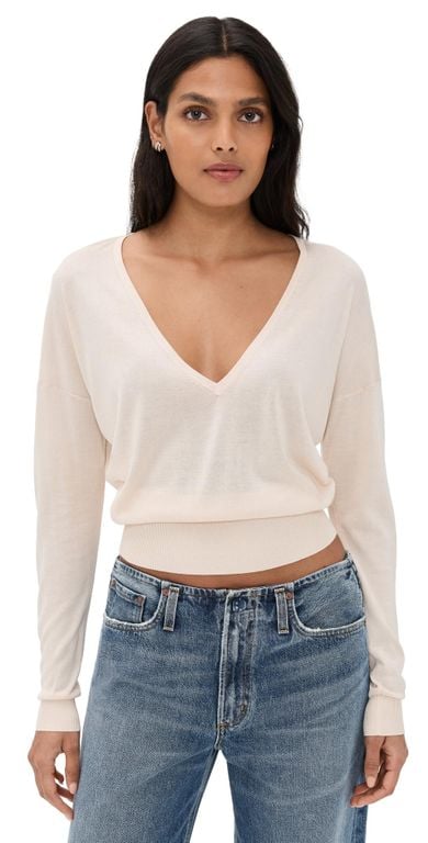 Women's RENGGLI Silk Cashmere V Neck Sweater - Blue - Sweaters Fabric: Lightweight stretch jersey. Ribbed elastic cuffs and waistband. V neck. Long sleeves with dropped shoulders. Shell: 85% silk/15% cashmere. Hand wash. Imported, China....