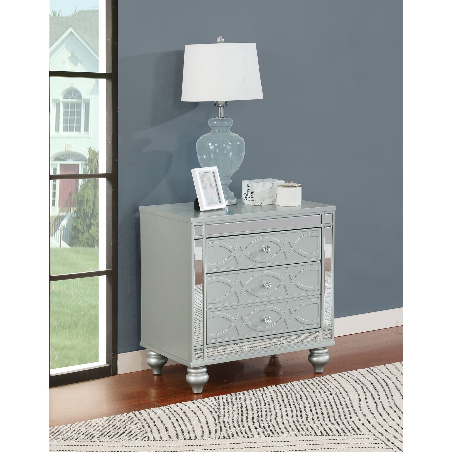 2 Drawers Nightstand with Fret Work Detail in Silver Metallic