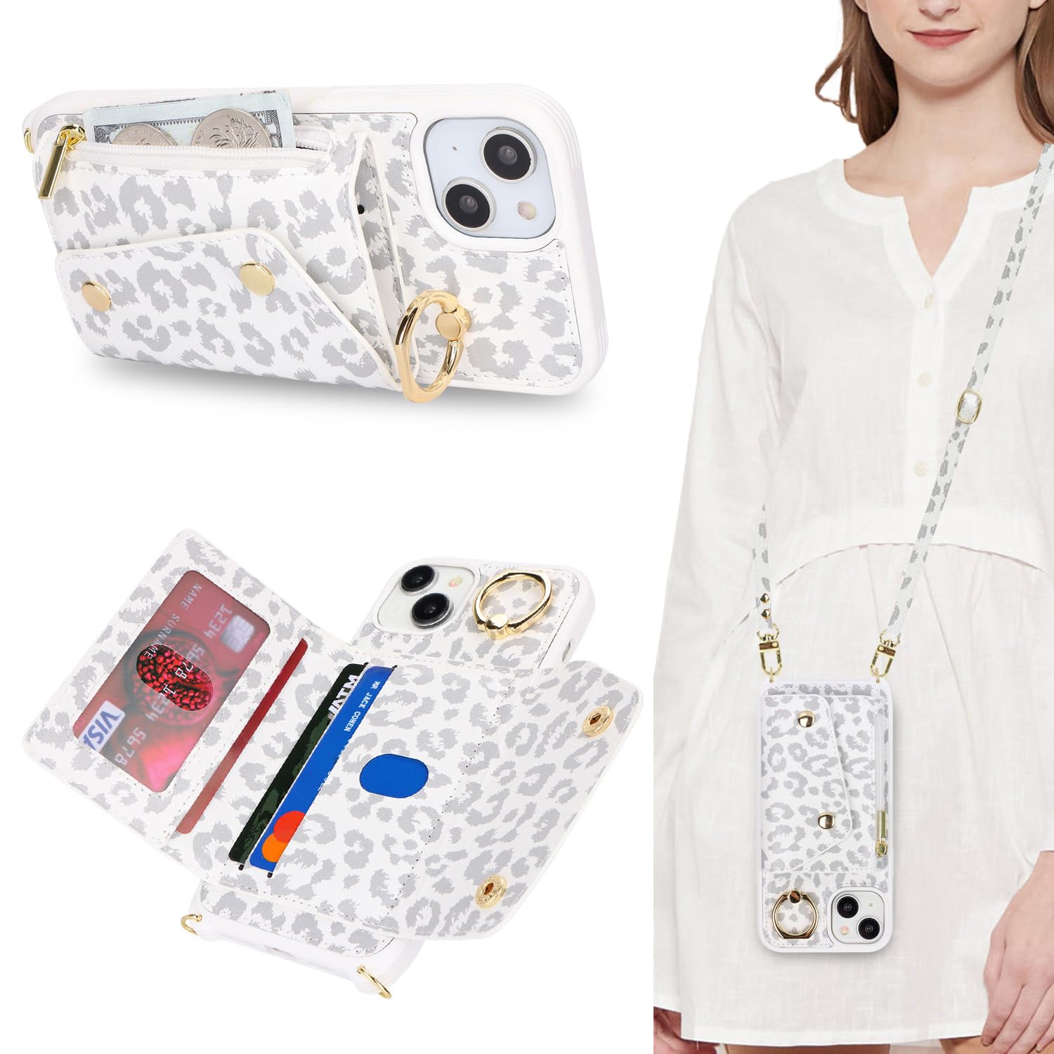Lipvina for iPhone 14 Plus Case with Card Holder and Strap - Zipper Pocket,Crossbody Lanyard Strap,Credit Card Holder,Stand Ring,Cute Phone Wallet