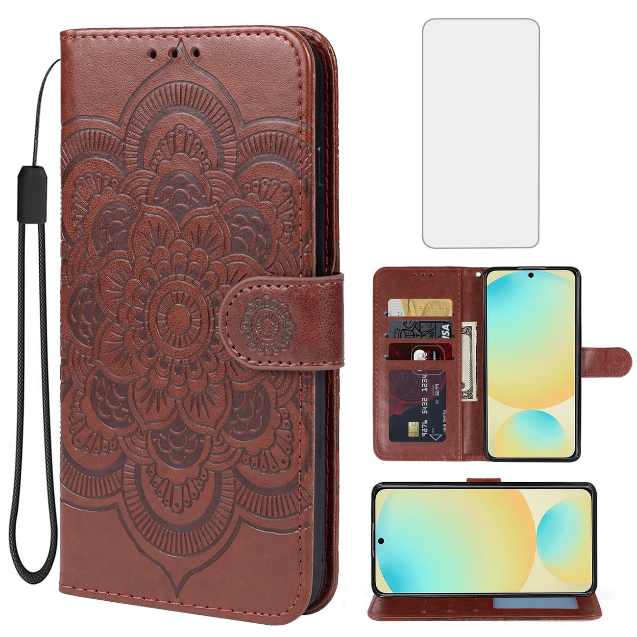 Bohefo Case for Galaxy S24 FE, for Samsung S24 FE SM-S721U Wallet Case with Tempered Glass Screen Protector, Mandala Leather Flip Credit Card Holder