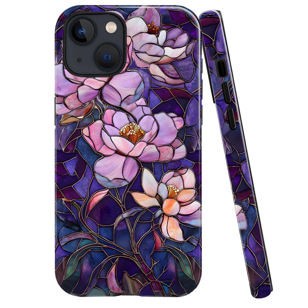 Case for iPhone 15,Fits Glossy Case Design for Girl Women,Stained Glass Flower Floral Purple