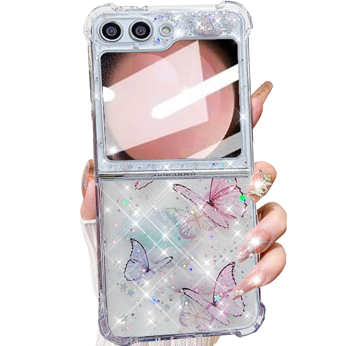 ❥【Compatible with Samsung Galaxy Z Flip 7 FE/Samsung Galaxy Z flip 6】the Glitter Bling Shiny Sparkle Butterflies animal print Floral Aesthetic Elegant Clear Crystal Shockproof Case for women girls is ONLY Designed for Samsung Galaxy Z Flip 7 FE 5G (2025)/Samsung Galaxy Z flip 6 5G (2024), Not