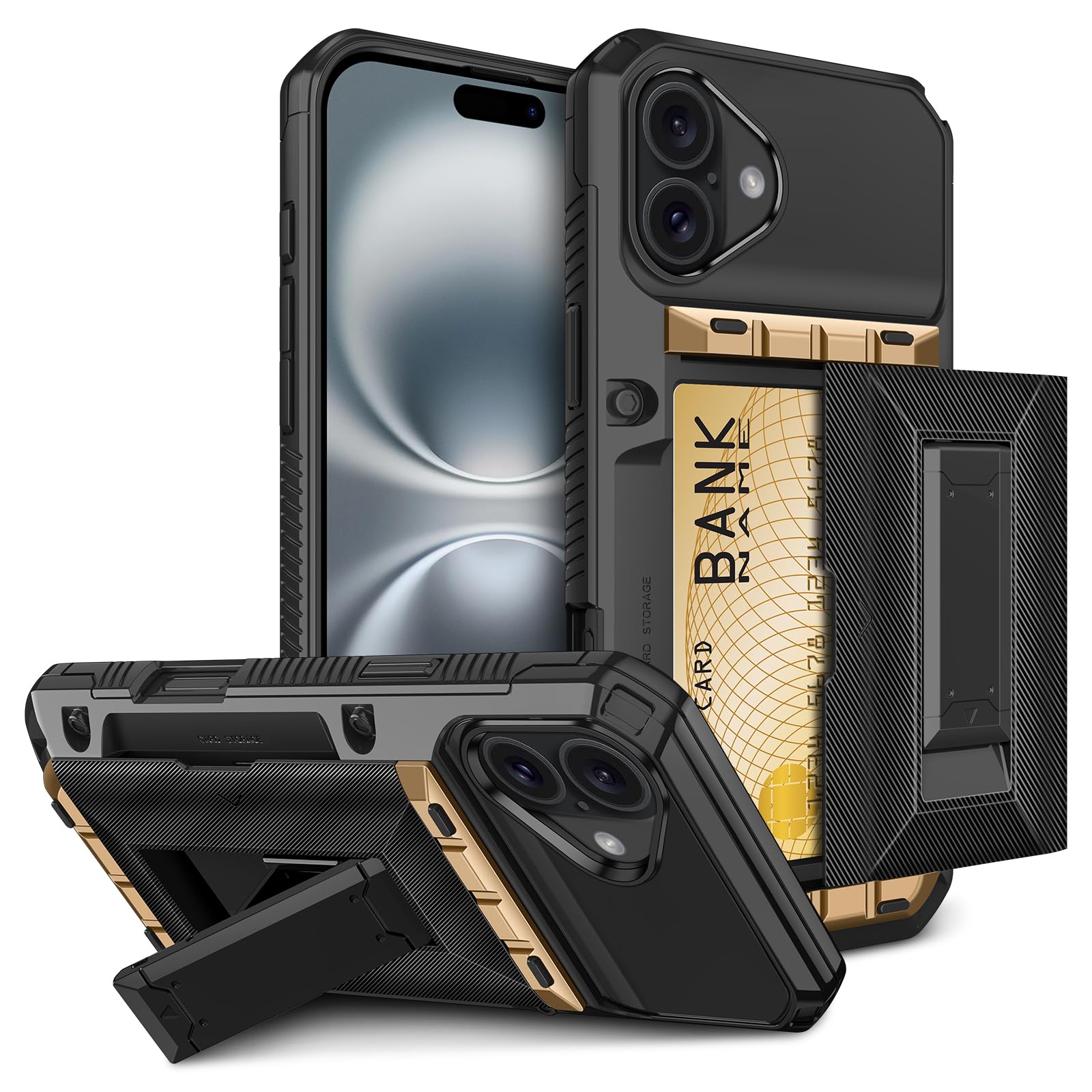 for iPhone 16 Case with Card Holder [Store 3-5 Cards] Armor Military Grade Protective Phone Cover with Kickstand Rugged Heavy Duty Protection