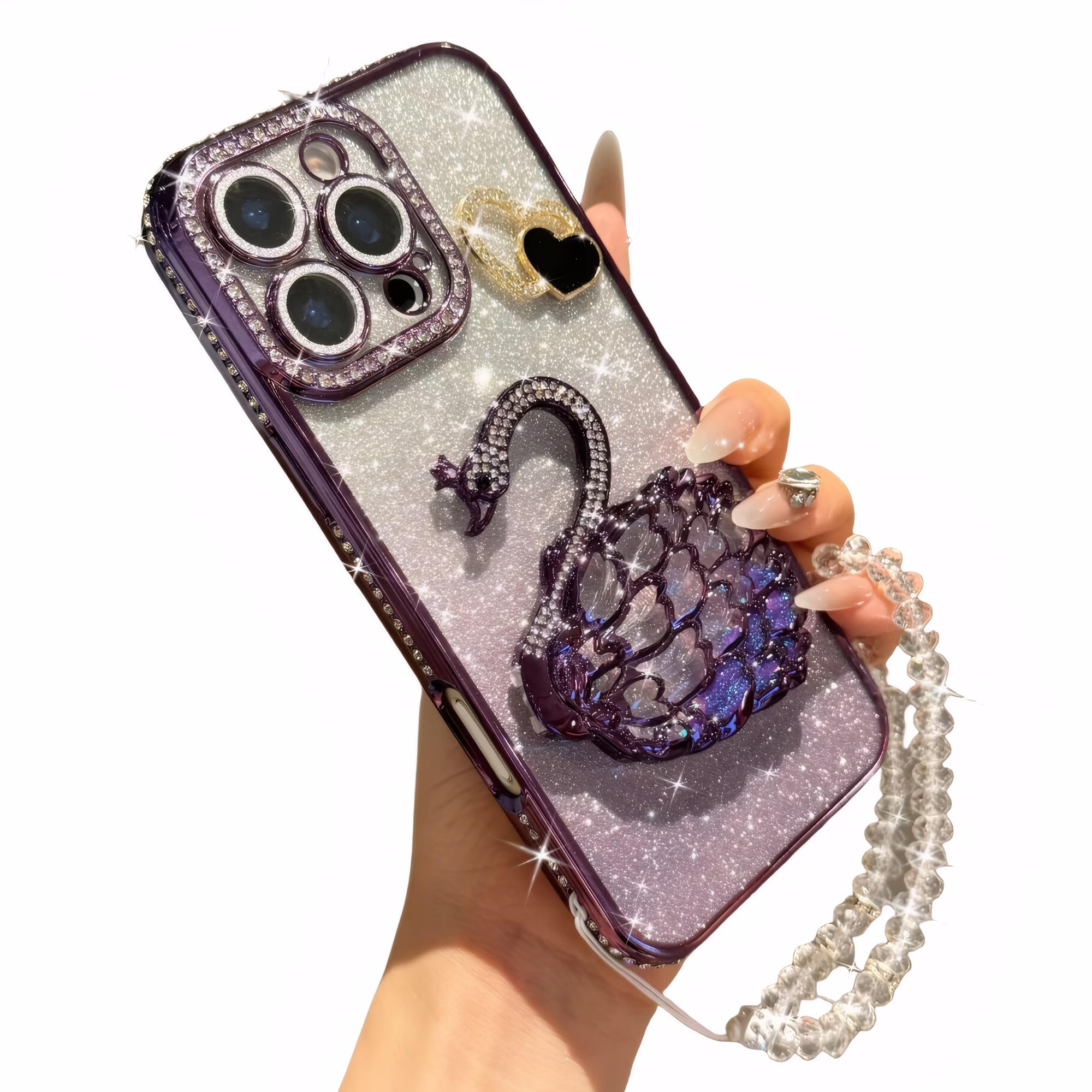 Shockproof Design: This exquisite case is specifically designed to provide robust protection against shocks and drops, ensuring your Phone remains safe from accidental impacts. Swan Diamond Encrusted: Adorned with sparkling swan diamond embellishments, this stand cover adds a touch of elegance and s