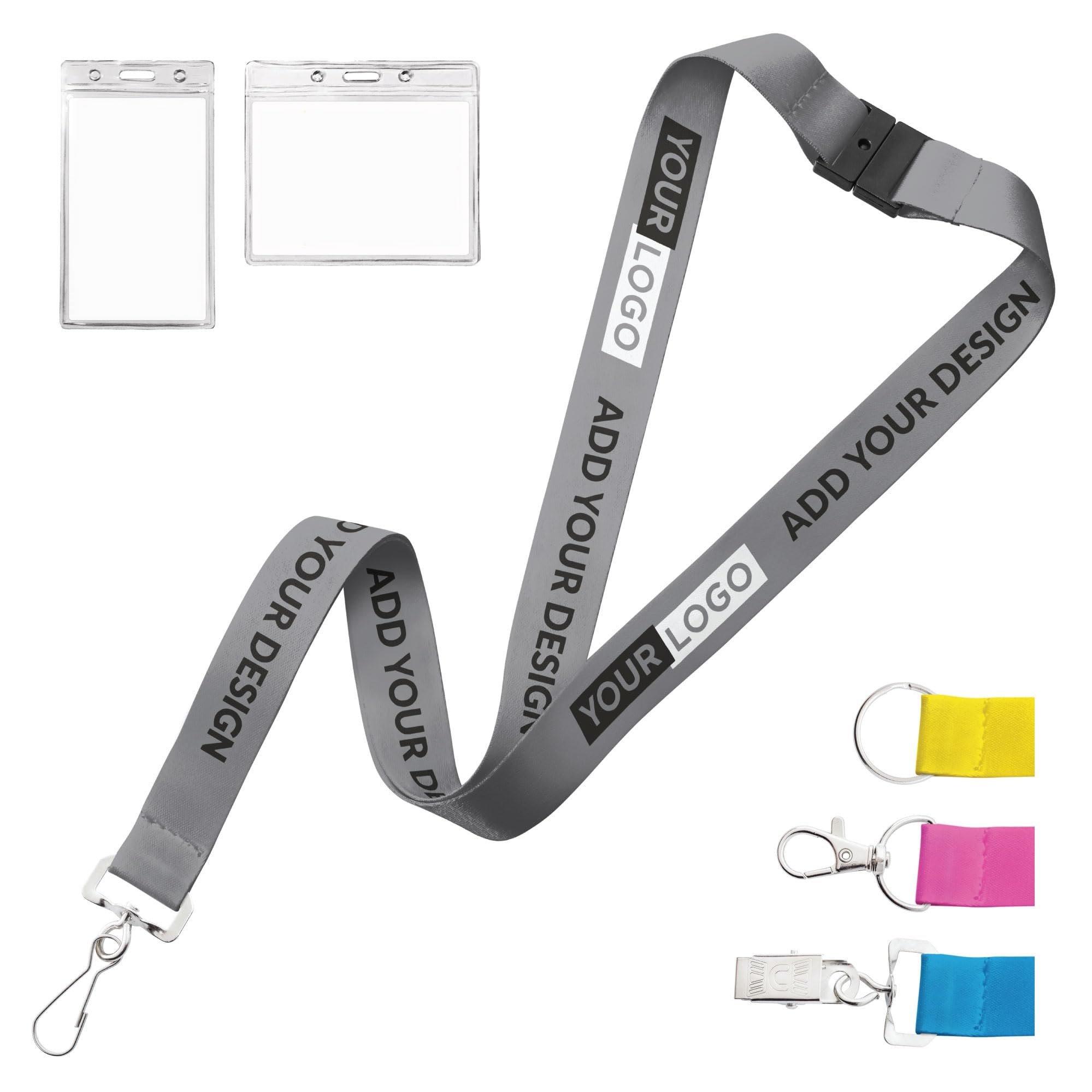 CUSTOMIZABLE: Upload logos or designs and personalize your lanyards with a variety of font and color choices BREAKAWAY SAFETY CLIPS: Each lanyard comes with a breakaway neck safety clip for school, workplace, and jobsite safety requirements. 4 ATTACHMENT OPTIONS: Choose from a Bulldog Clip, Lobster