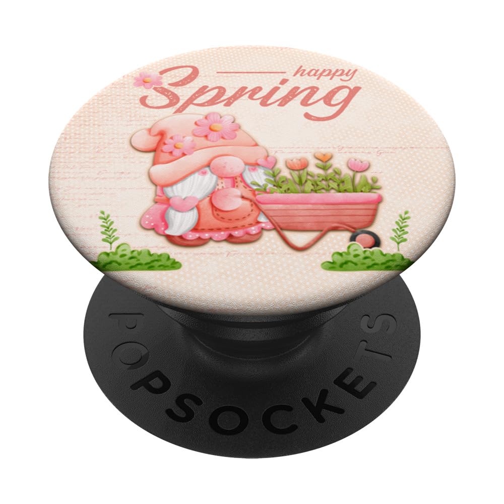 Spring design, dwarf with wheelbarrow full of flowers, and an inscription "Happy Spring", bees. Light pink background. Funny garden gnome as a gift for garden lovers who love gardening and always take care of their garden. Adhesive backing attaches the PopGrip to your case or device. Will not stick