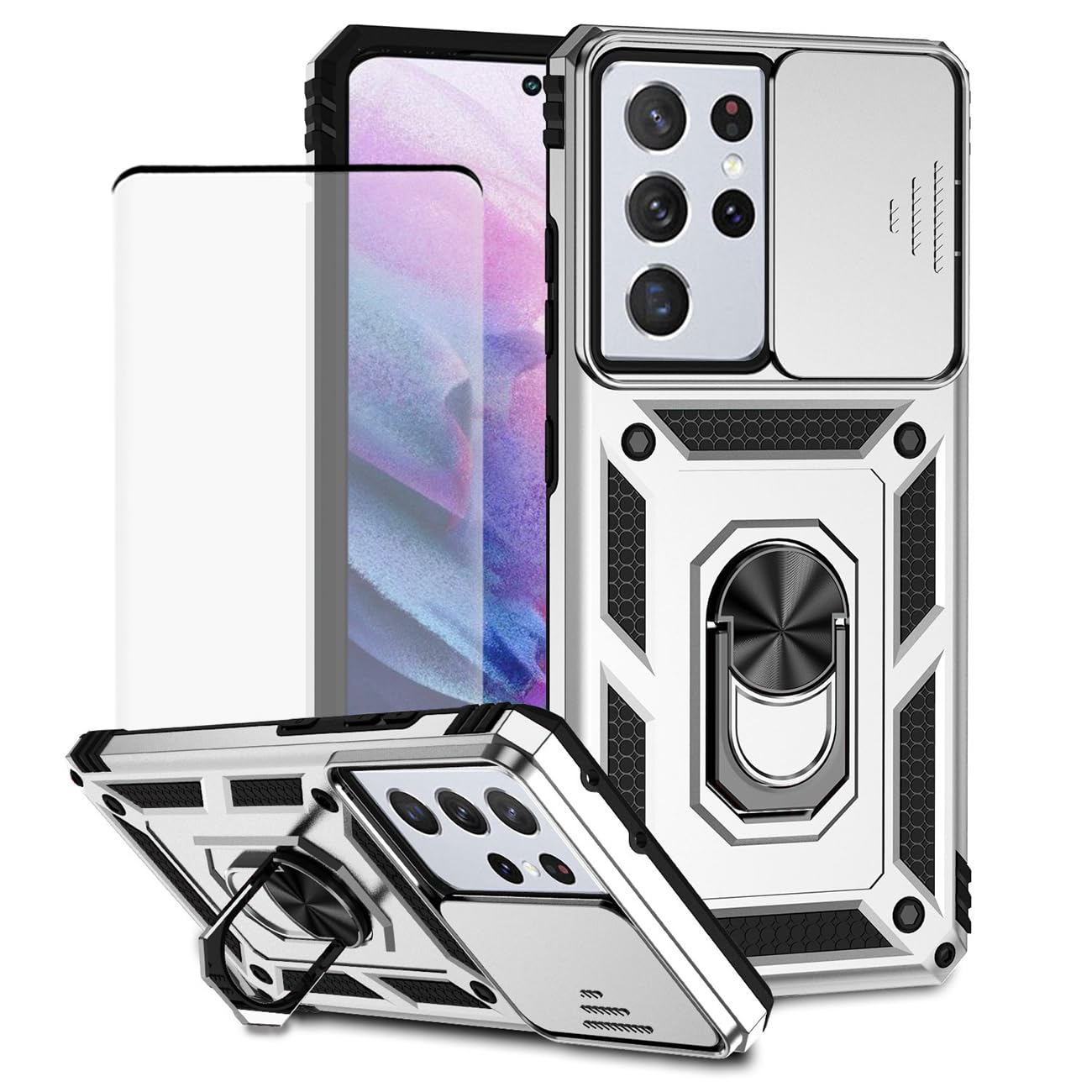 Yodueiv for Galaxy S21 Ultra Case/Samsung S21 Ultra SM-G998 Case with Tempered Glass Screen Protector and Slide Camera Cover,Magnetic Ring Car Mount