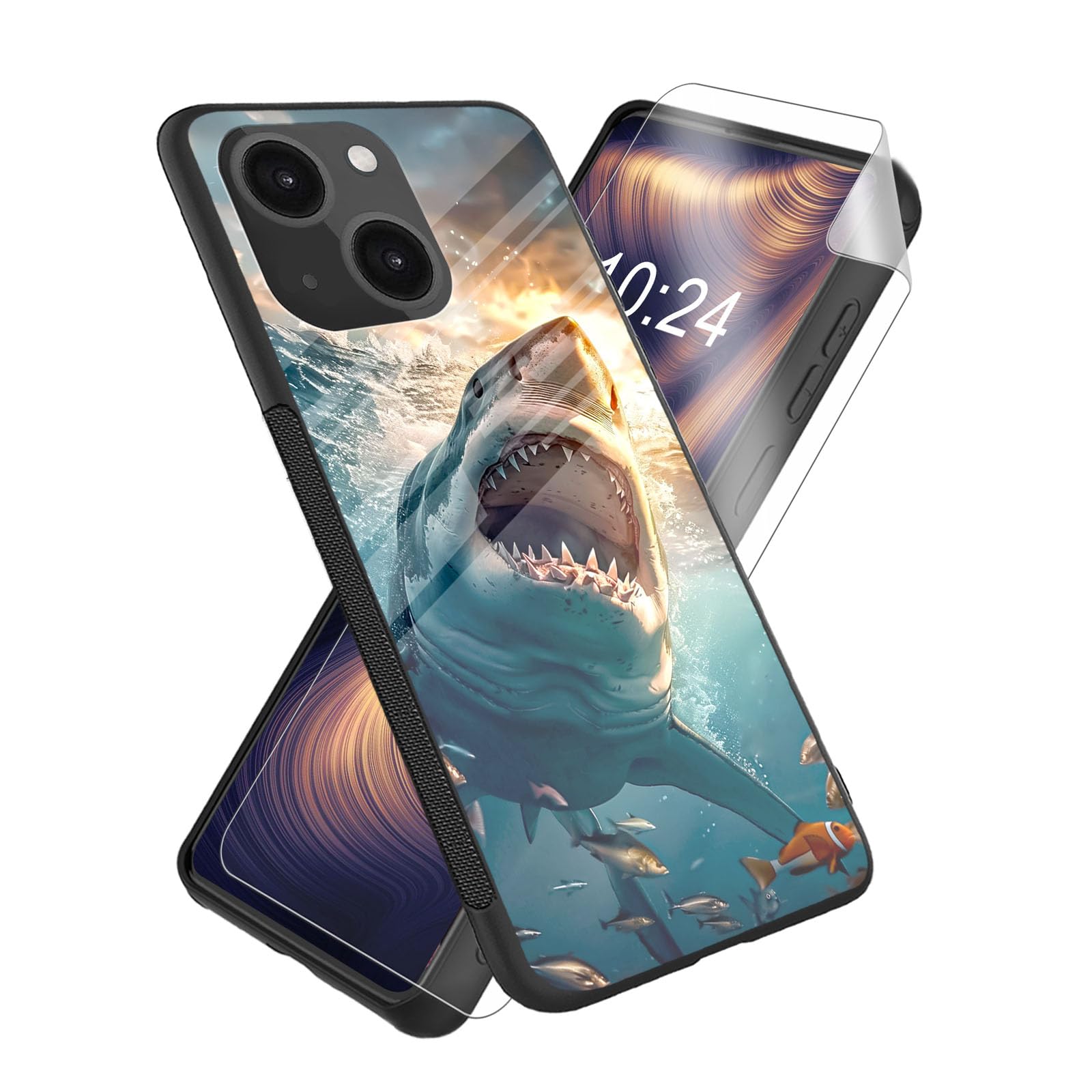 ETLKJVBL for iPhone 14 Case, Megalodon Shark High-Definition Painted Glass Back Cover with Soft Silicone TPU Bumper, Shockproof Protective for iPhone