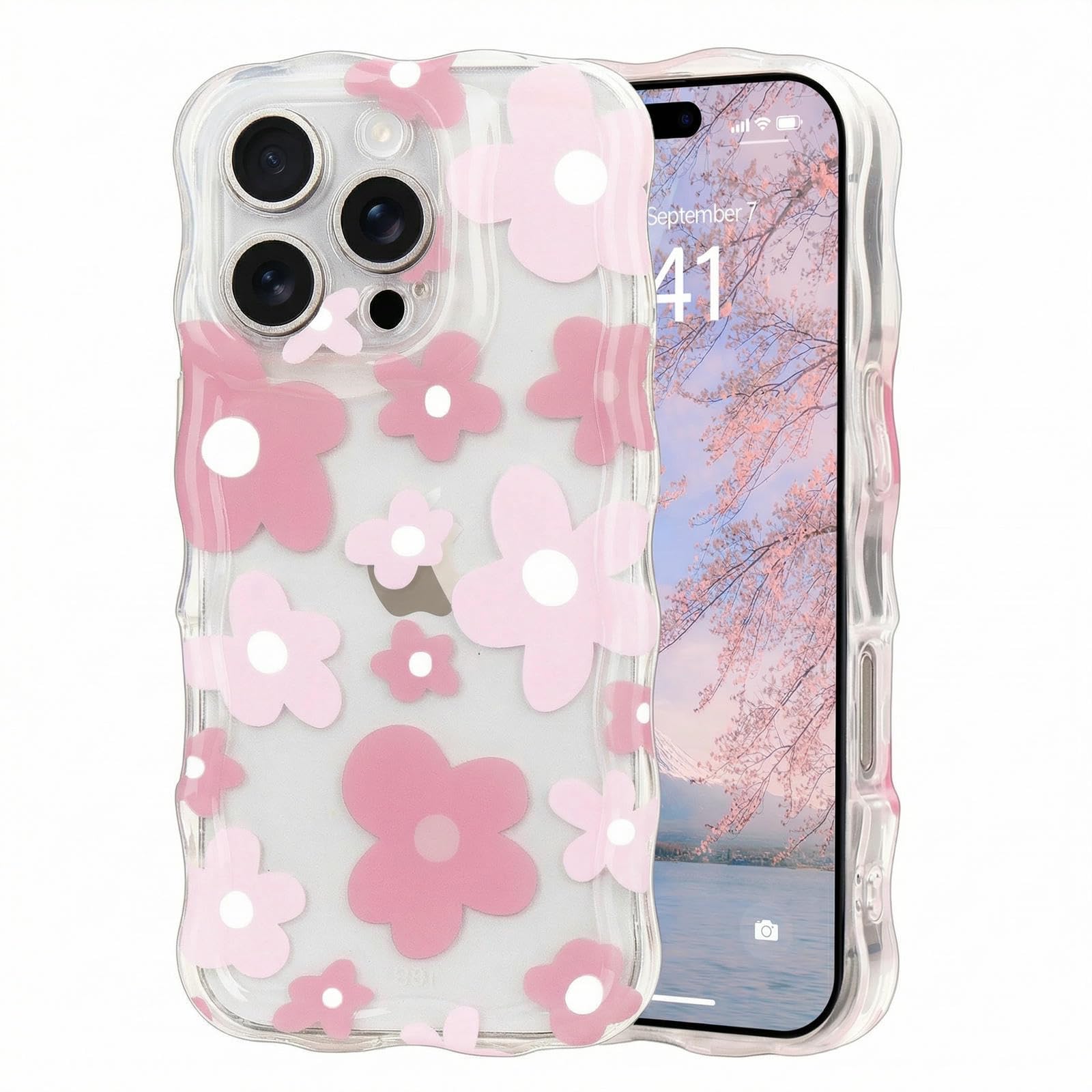 Micoden for iPhone 16 Pro Max Case, Cute Floral Girls Women Soft Case Silicone Shockproof Curly Wave Wavy Edge Camera Protection Cover Clear Thin[Non