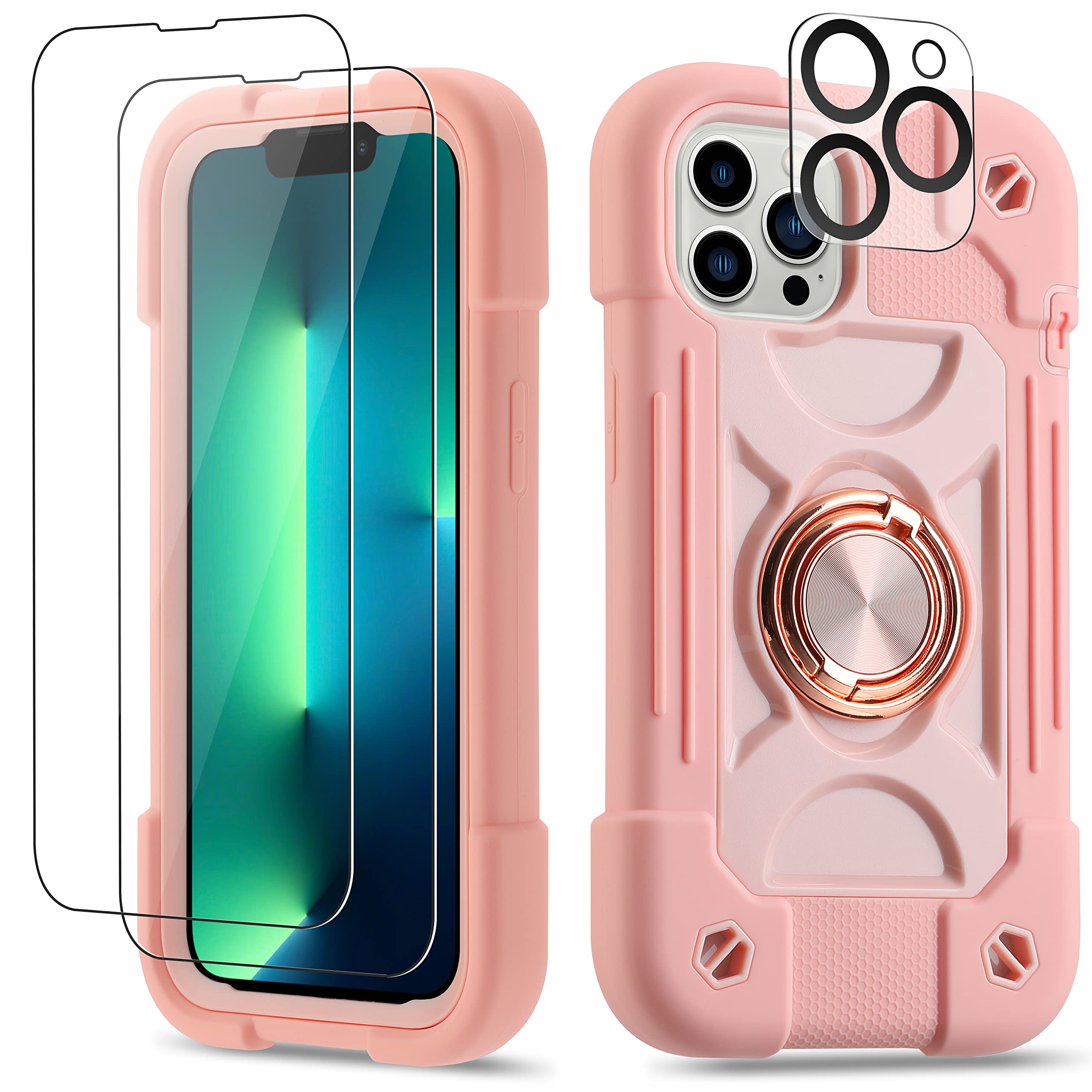 Cookiver for iPhone 13 Pro Case 6.1 Inch with Ring Stand, with 2 Pack Glass Screen Protector + 1 Pack Camera Lens Protector,Heavy-Duty Shockproof