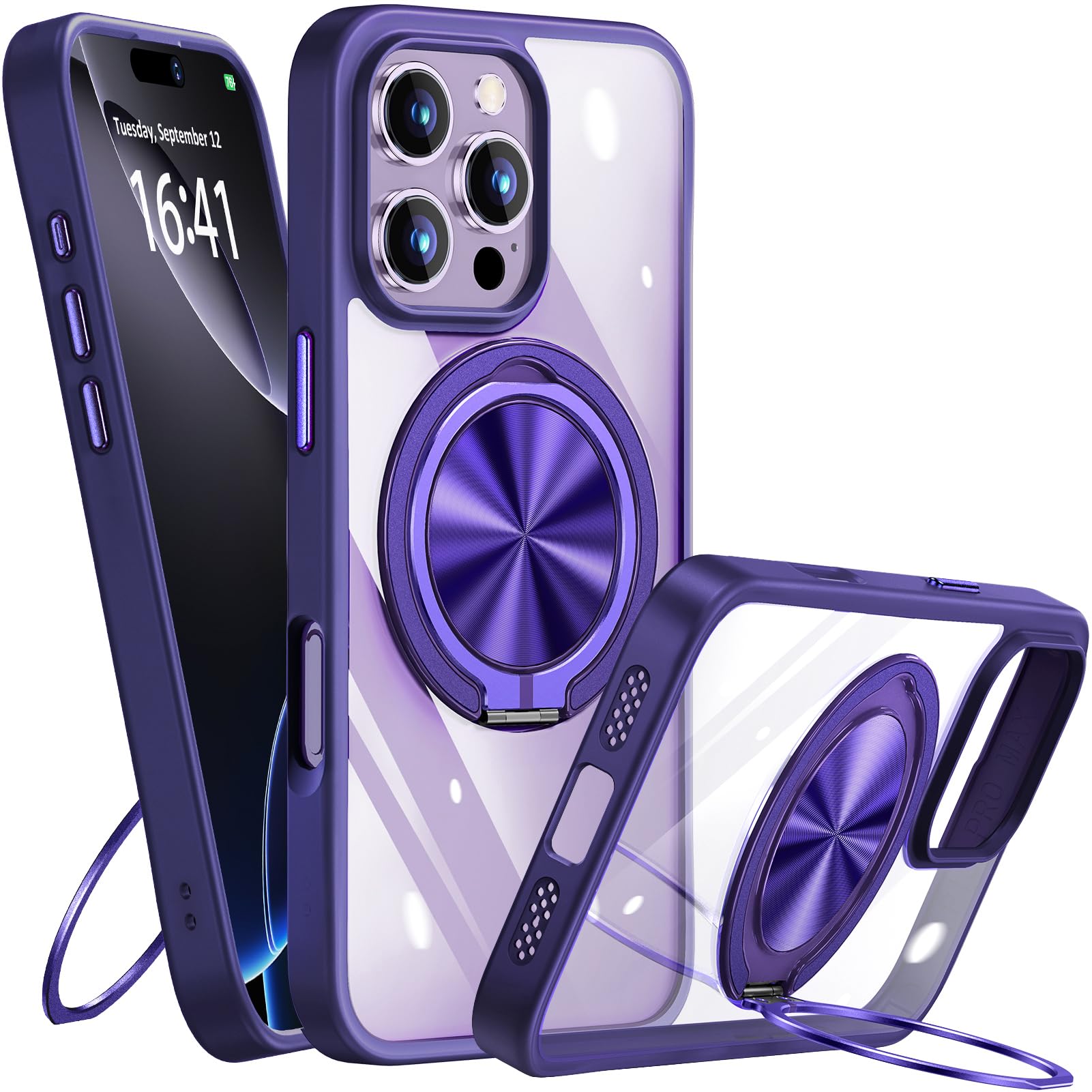 FTLSPMZT 360° Rotatable Ring & 180° Foldable Stand Clear Case for 16 Pro Max, Compatible with MagSafe, Non-Yellowing, Military Drop Protection,
