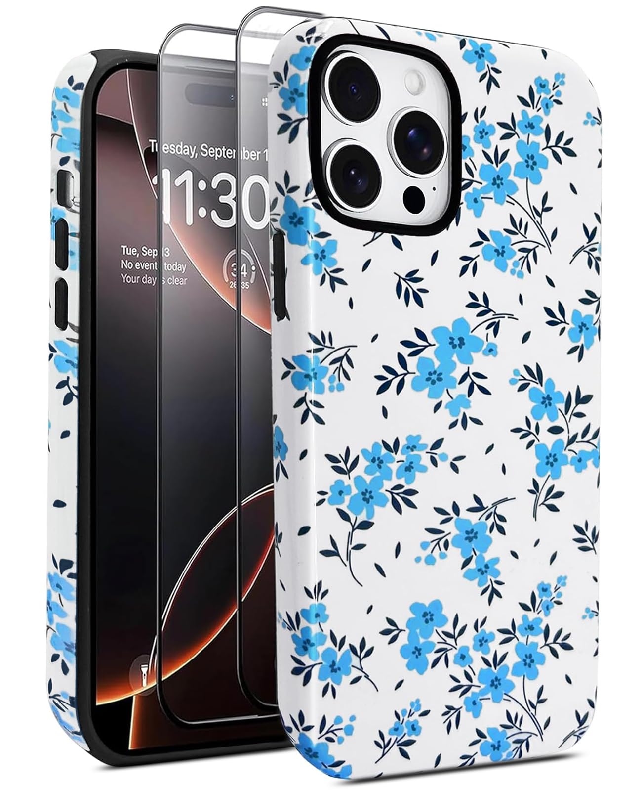 J.west for iPhone 14 Pro Max Case 6.7" with 2 Pack Tempered Glass Screen Protectors Cute Floral Flowers Hybrid Cover for Girls Women Aesthetic
