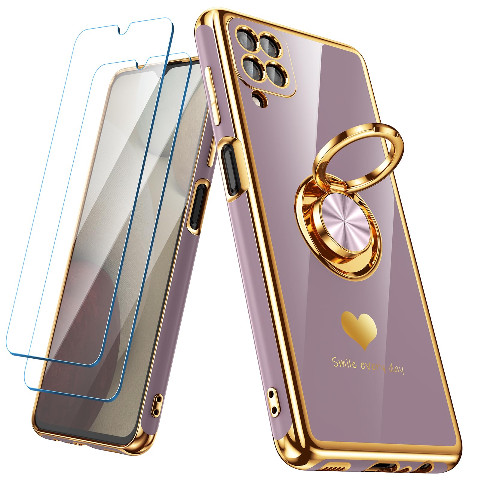 Nonional for Samsung Galaxy A12 Case with 2 Pack Screen Protector, 360° Rotatable Ring Holder [Luxury Hearts Pattern] Plating Gold Edge Slim Soft