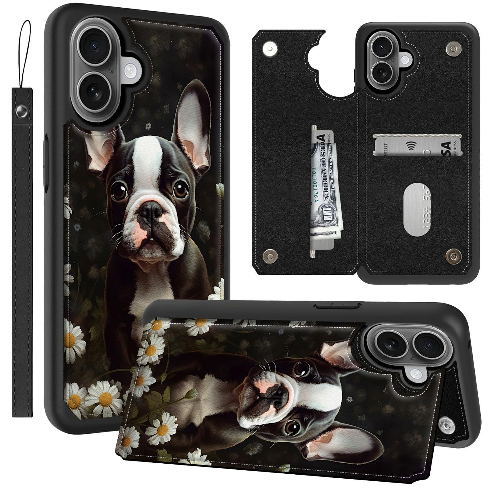 GFRGTFHYT for iPhone 16 Plus Wallet Case 6.7" Boston Terrier Dog PU Leather Wrist Strap Credit Card Holder Slots Magnetic Clasp Kickstand Flip