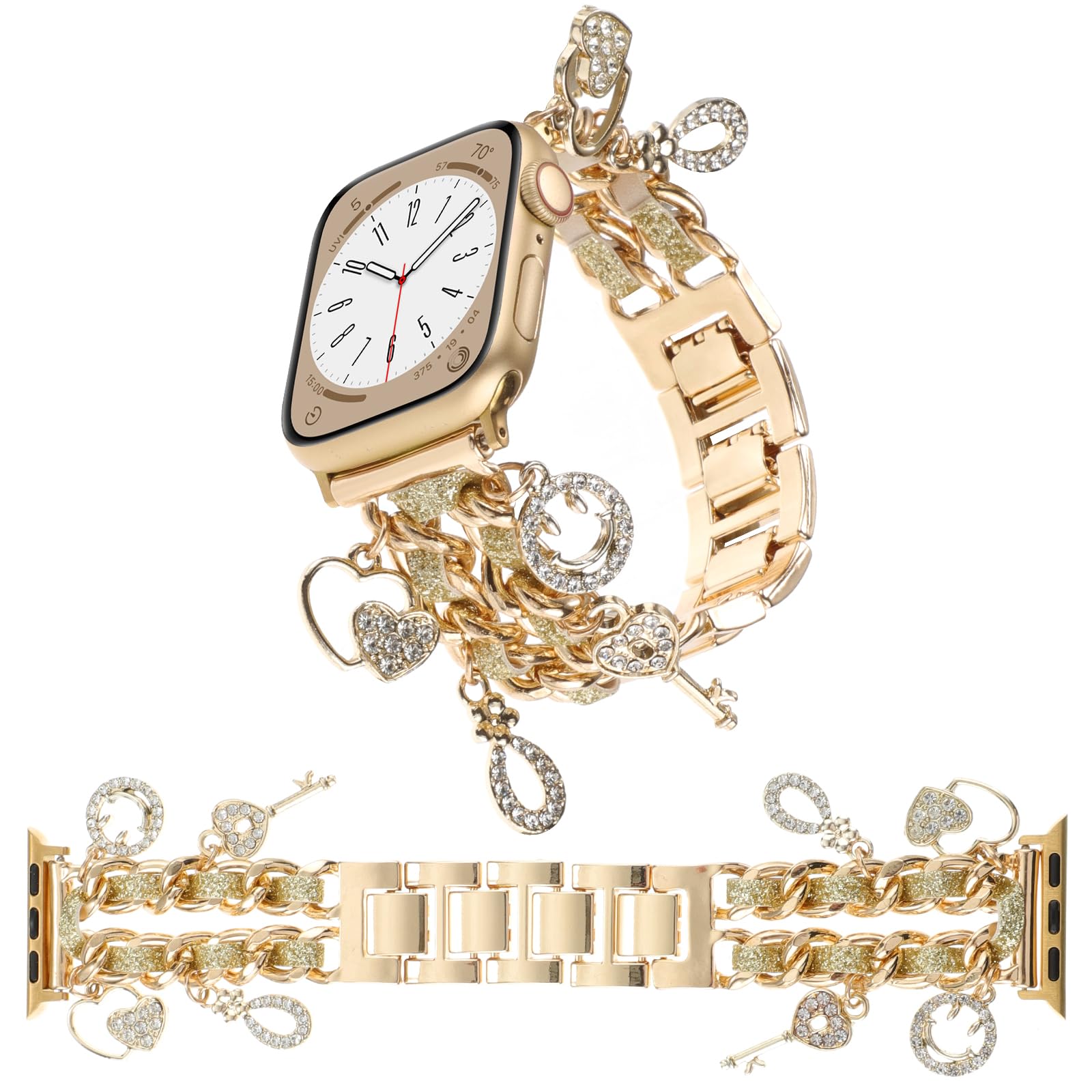 ★【Compatible Models】:Size 38/40/41 for:42mm(Series 10,11),41mm(Series 7 8 9),40mm(Series 4 5 6 SE1-3),38mm(Series 1 2 3). ★【Unique & Exquisite】:Unique and fashion watch band with glitter gold leather belt passing through the gold cuban chain,paired with different cute sparkly pendants:2