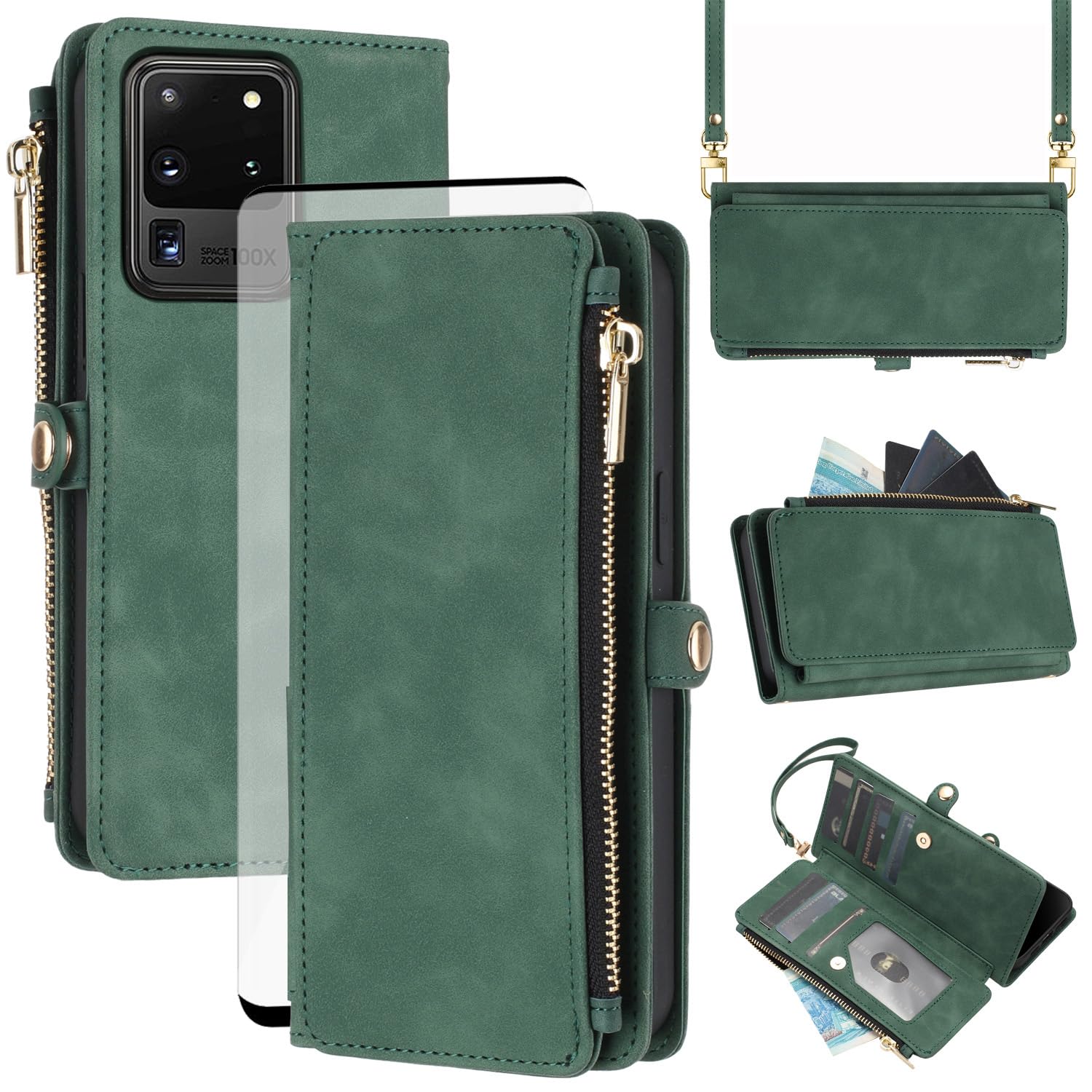 Asuwish Phone Case for Samsung Galaxy S20 Ultra 5G Zipper Wallet Cell Cover with Tempered Glass Screen Protector Crossbody Strap Flip Credit Card